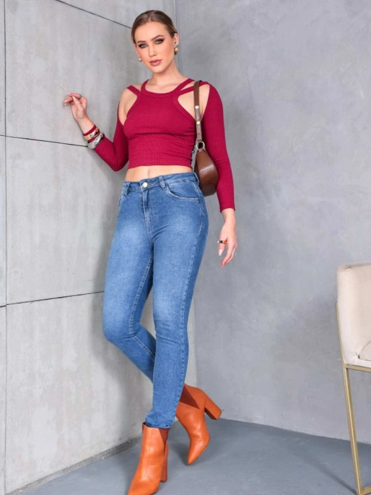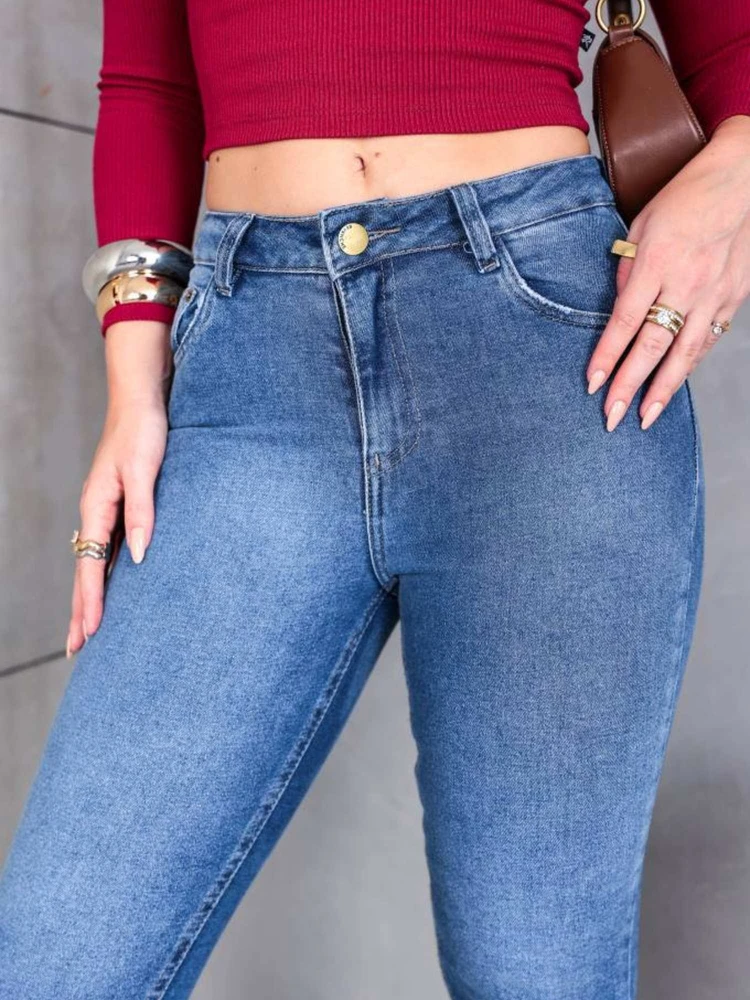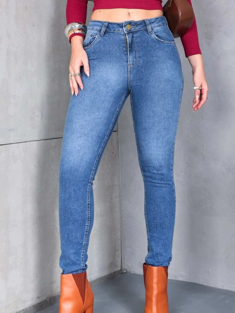 Calça feminina confeccionada em jeans de alta qualidade, com modelagem skinny, que valoriza as curvas e oferece caimento ajustado do quadril até a barra.