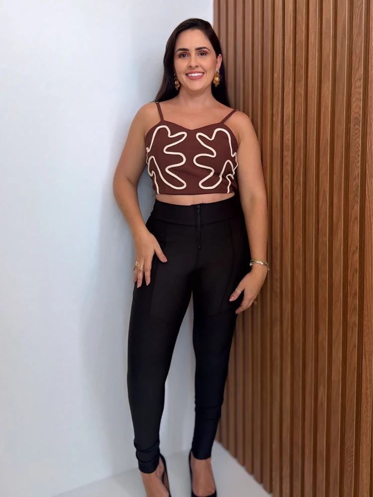 Confeccionada em tecido com leve brilho e efeito semelhante ao couro, ela entrega um look sofisticado sem abrir mão do conforto. O material possui elasticidade, garantindo ajuste ao corpo sem limitar os movimentos — ideal para o dia a dia ou produções mais elaboradas.