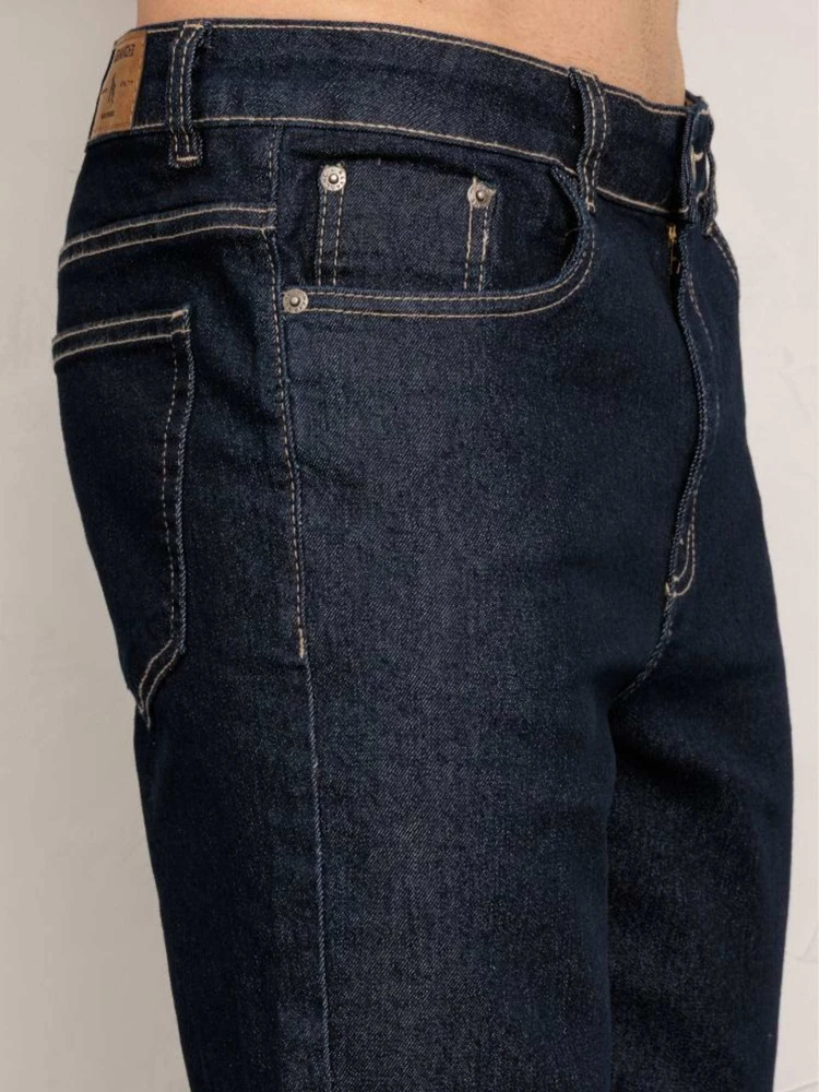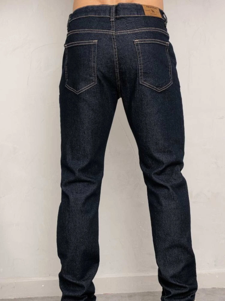 A lavagem escura com costuras aparentes dá um visual clássico e versátil ? vai do casual ao alinhado com facilidade.