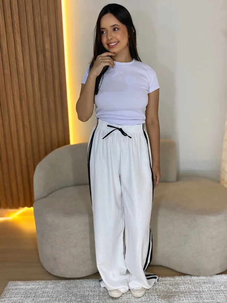 A Calça Pantalona Com Listra do Lateral é a peça perfeita para quem busca conforto e estilo em um único produto. Confeccionada em tecido leve e macio, ela proporciona um caimento impecável e garante total liberdade de movimentos.