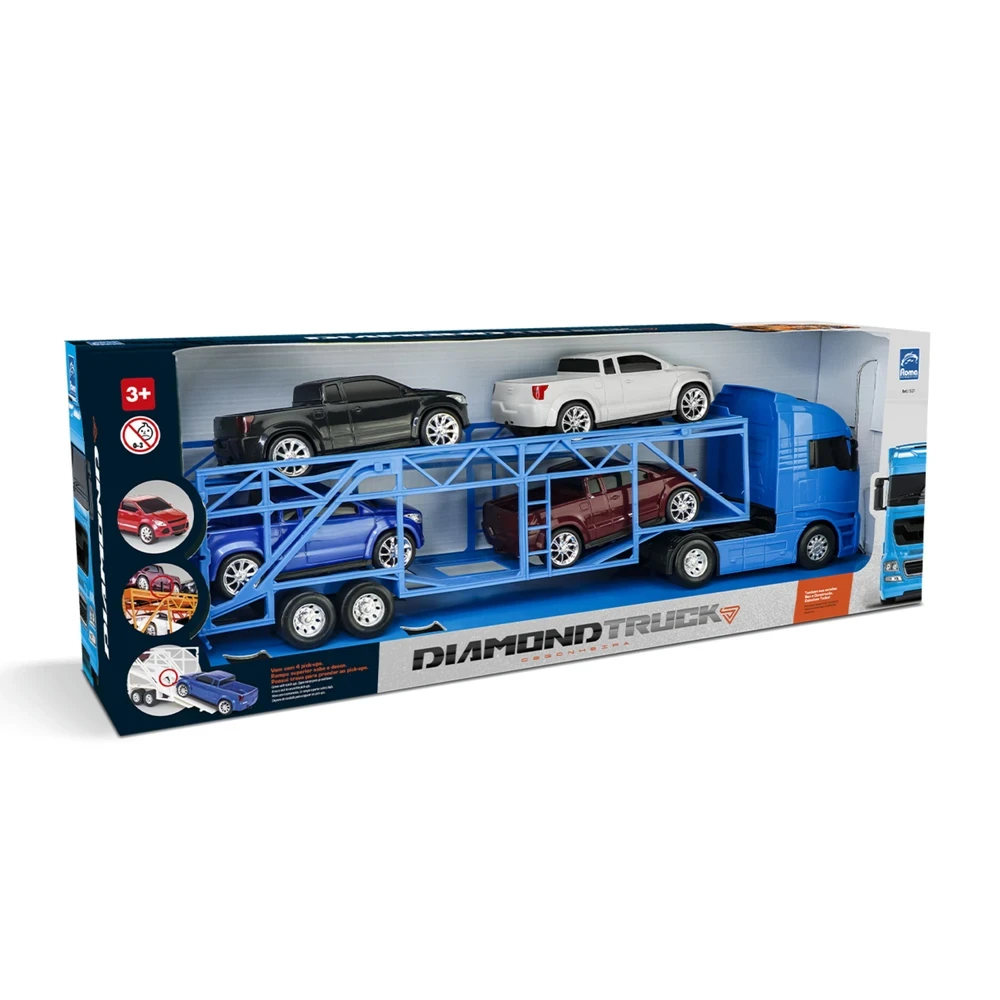 A diversão vai ganhar velocidade com o Caminhão Cegonha da linha Diamond Truck da Roma Jensen! Uma super máquina equipada com rampa superior que sobe e desce, com trava para manter as pick-ups no lugar durante o transporte. O brinquedo acompanha 4 carrinhos tipo pick-up para a brincadeira ficar ainda mais completa.