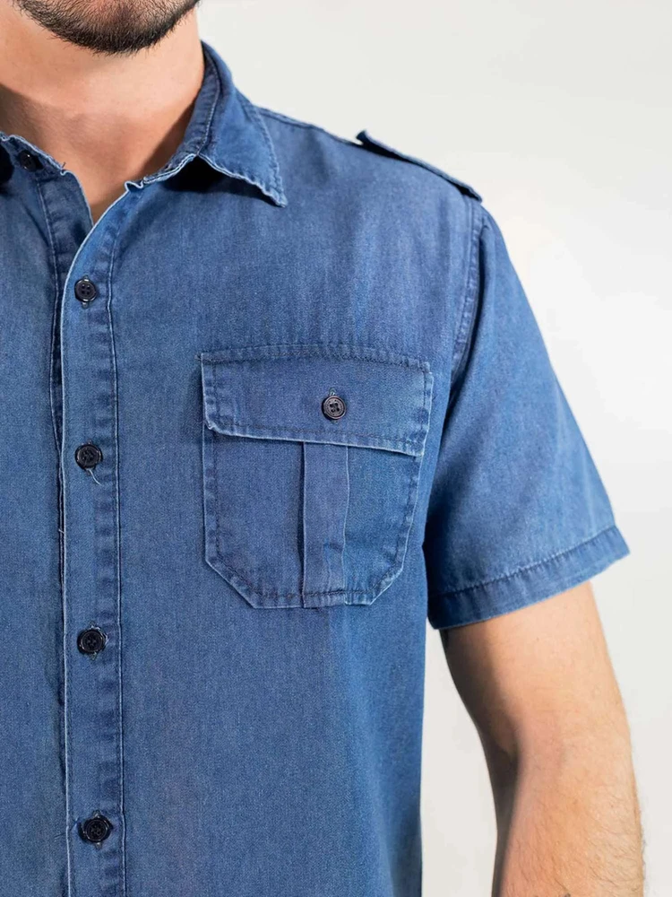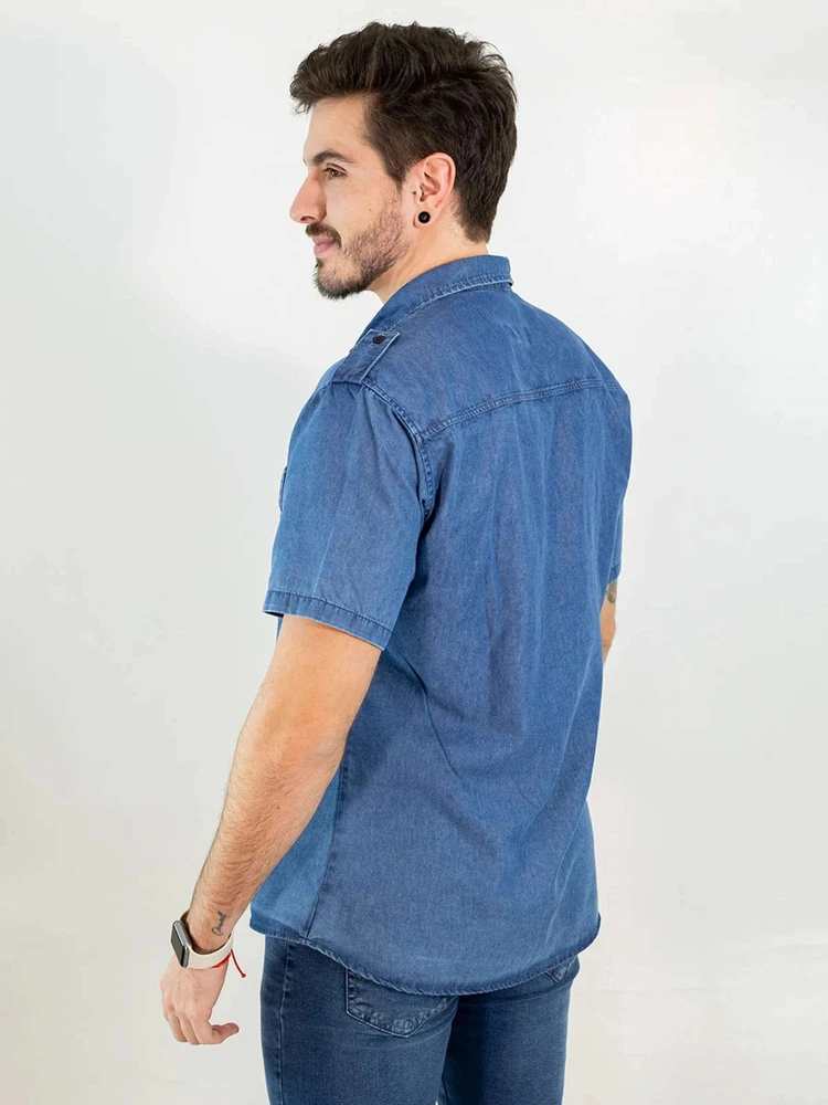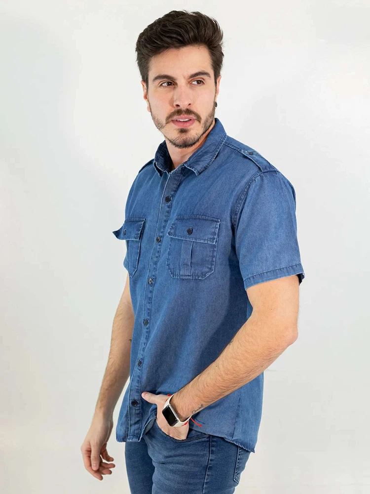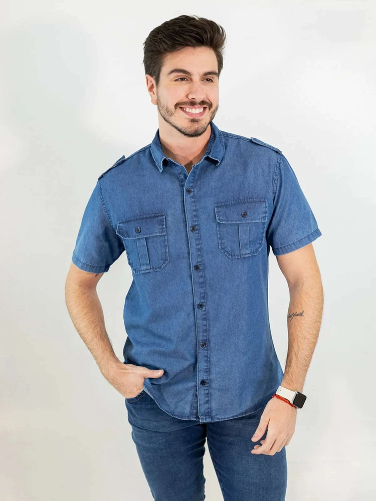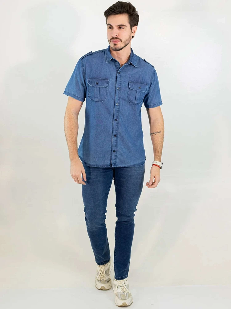 Camisa masculina em jeans leve, com bolsos frontais, manga curta e fechamento em botões.