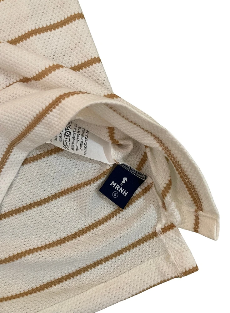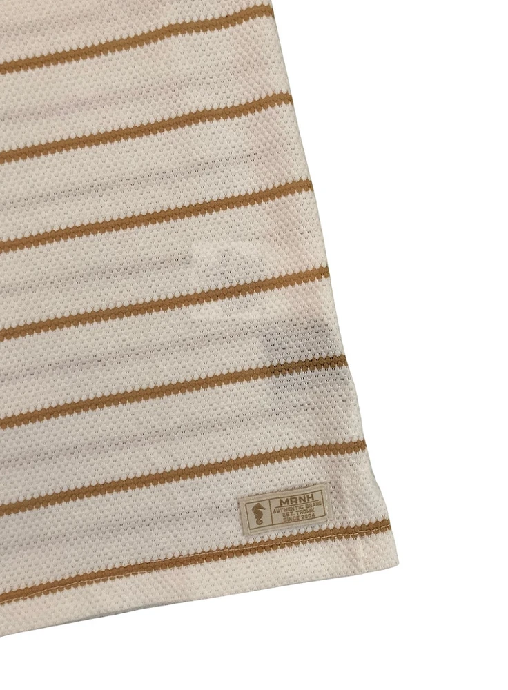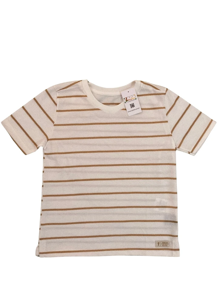 Seja para brincar no parque ou passear, esta camiseta une praticidade e charme em uma peça única, que seu filho vai adorar vestir todos os dias. - Malha leve e arejada, perfeita para o verão - Modelagem confortável que não restringe movimentos - Listras discretas em tons bege e branco para estilo atemporal - Acabamento reforçado