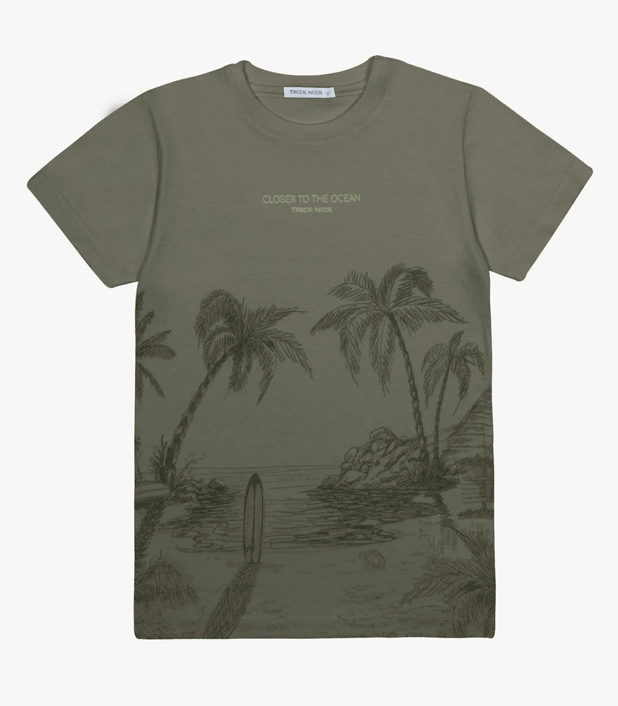 Camiseta infantil manga curta em meia malha, na cor verde militar com estampa exclusiva de palmeiras e praia, ideal para momentos de lazer e aventura dos pequenos. Confeccionada com tecido de alta qualidade, garante conforto e respirabilidade ao longo do dia. Seu design moderno traz uma vibe relax e natureza, perfeita para crianças que adoram explorar e estar perto do mar. A peça une estilo e praticidade, facilitando combinações no guarda-roupa infantil. Além disso, é fácil de lavar e mantém a cor e forma mesmo após várias lavagens.