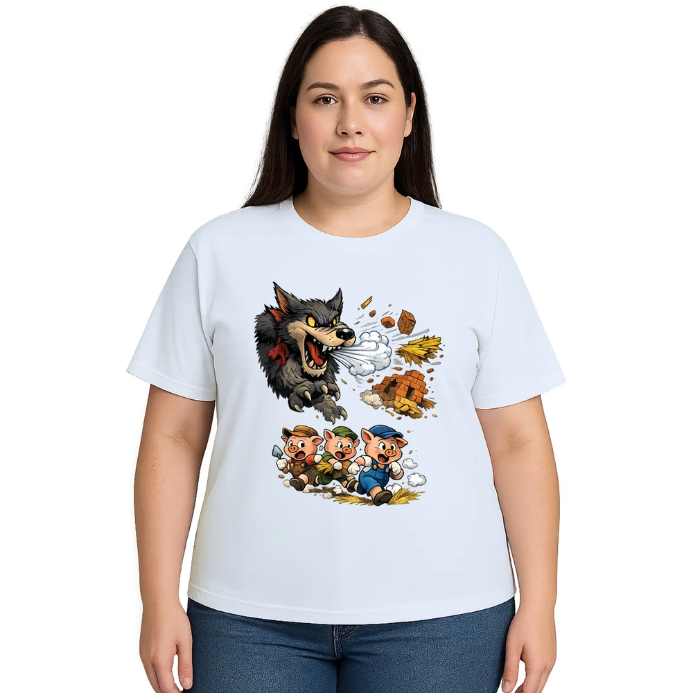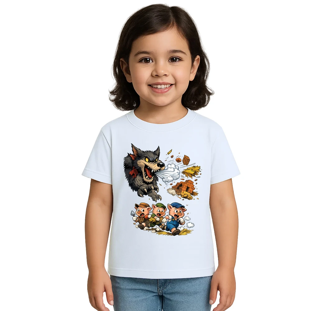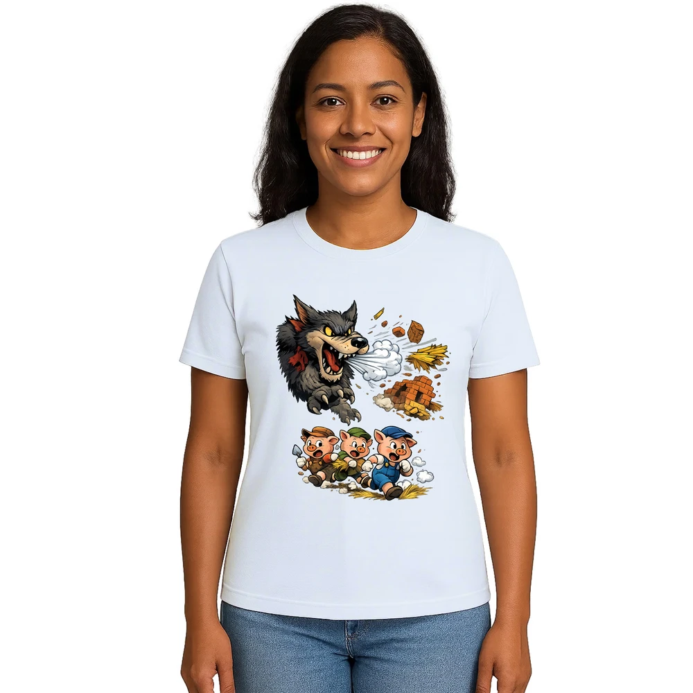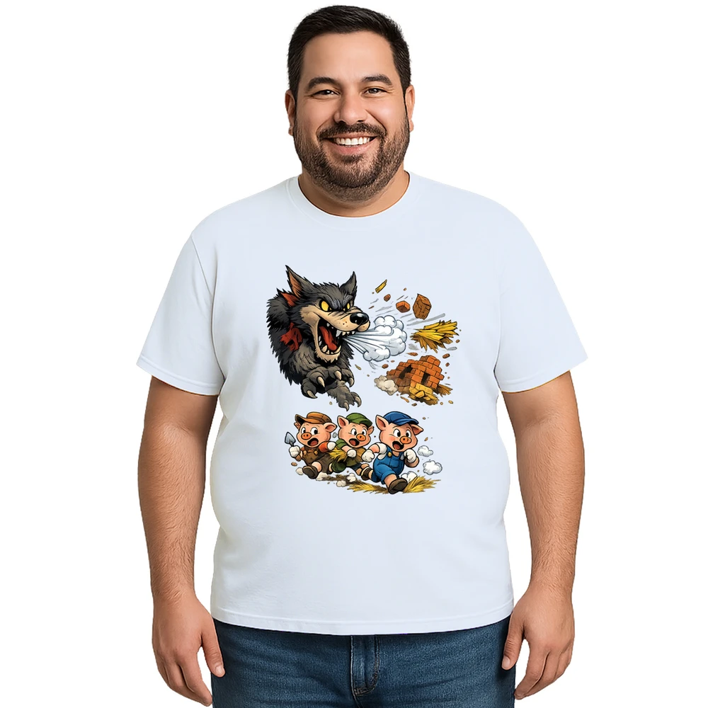 Conheça a Camiseta Lobo Mau e Três Porquinhos Correndo Personalizada, perfeita para você que adora histórias clássicas com um toque moderno. Feita em tecido de alta qualidade, garante conforto e durabilidade para o dia a dia. A estampa vibrante e detalhada retrata o icônico lobo soprando as casas enquanto os três porquinhos correm, despertando a imaginação e o senso de aventura.