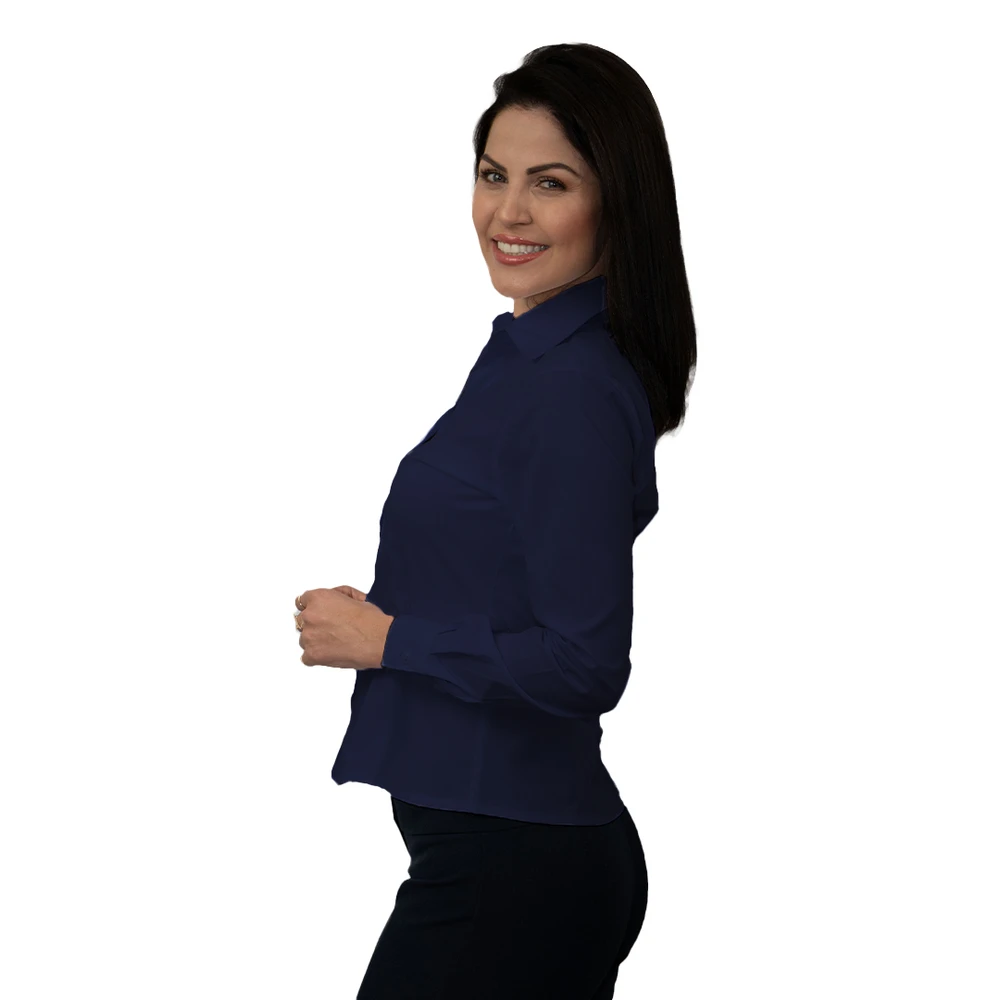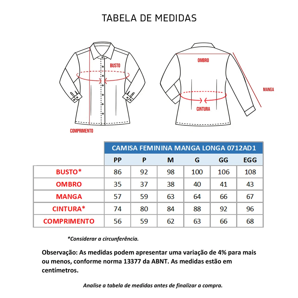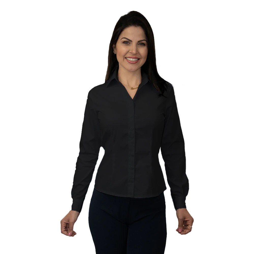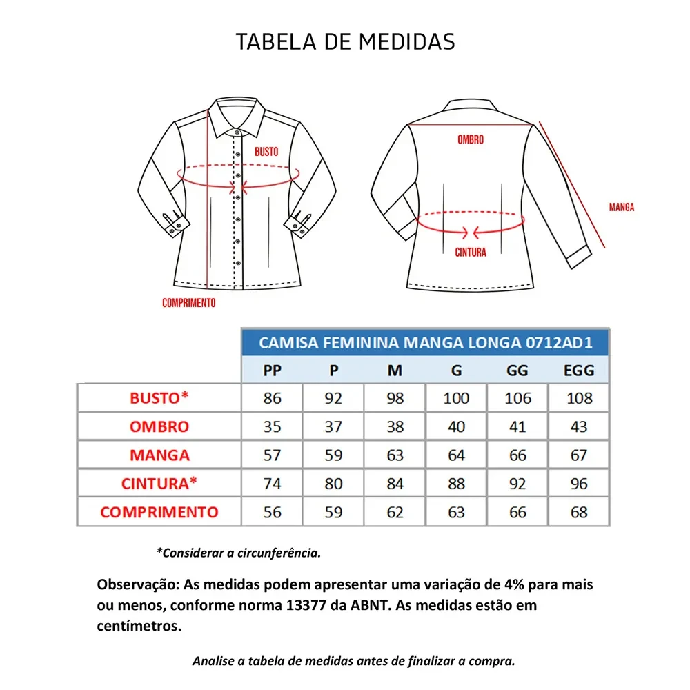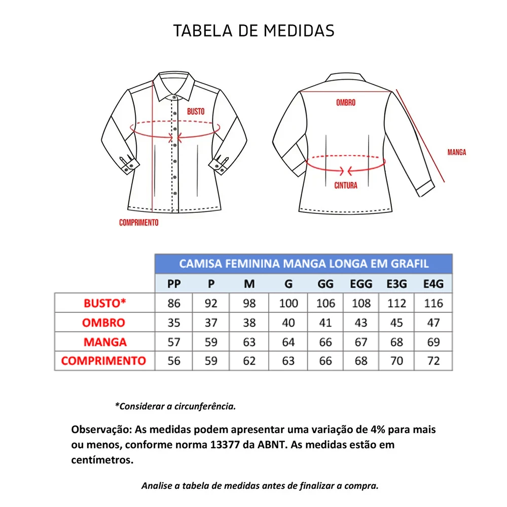 A Camisa feminina manga longa ACINTURADA, também chamada de Camisete é confeccionada em tecido Grafil, composição de: 67% Poliéster e 33% Algodão.