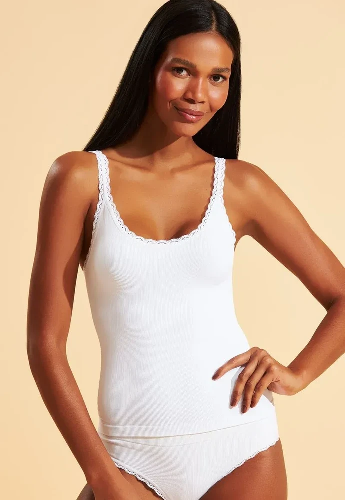 A camisete sem costura com renda Recco combina conforto, estilo e sustentabilidade em uma peça que modela suavemente as curvas. O detalhe delicado em renda sob o busto acrescenta feminilidade sutil, enquanto a textura canelada proporciona leveza e sensação de bem-estar durante o uso.
