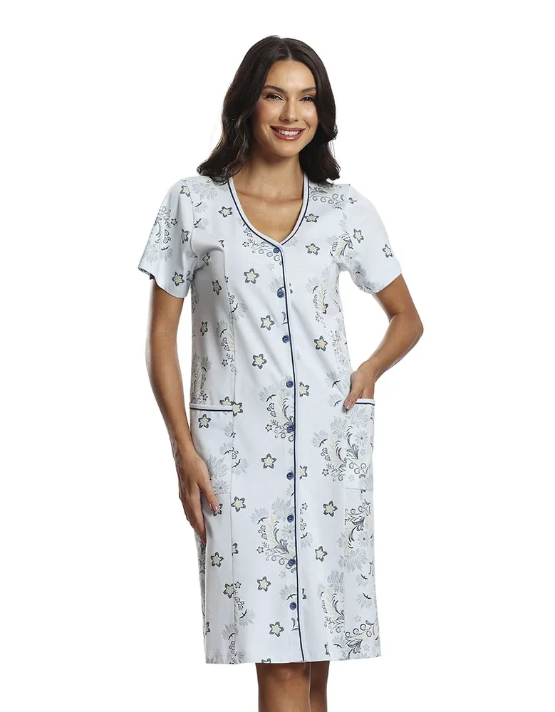 A camisola manga curta aberta Flora Paulienne une conforto, praticidade e estilo em uma peça versátil para o dia a dia. Confeccionada em malha de algodão pele de pêssego, proporciona toque suave e respirável, enquanto a estampa em silk screen na frente e nas costas adiciona um charme delicado. O decote em V com abertura frontal e fechamento por abotoamento facilita o vestir e o tirar, sendo ideal também para quem busca funcionalidade, e o bolso lateral oferece praticidade extra.