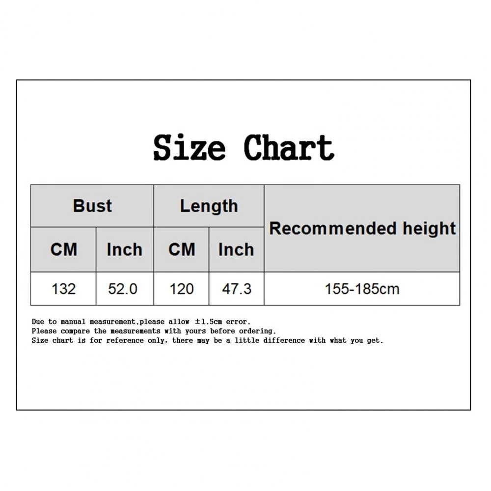 Comprimento: 120cm/47.2 ", circunferência do peito: 132cm/52", altura: 155cm-185cm/61.02 "-72.83" (aprox.)