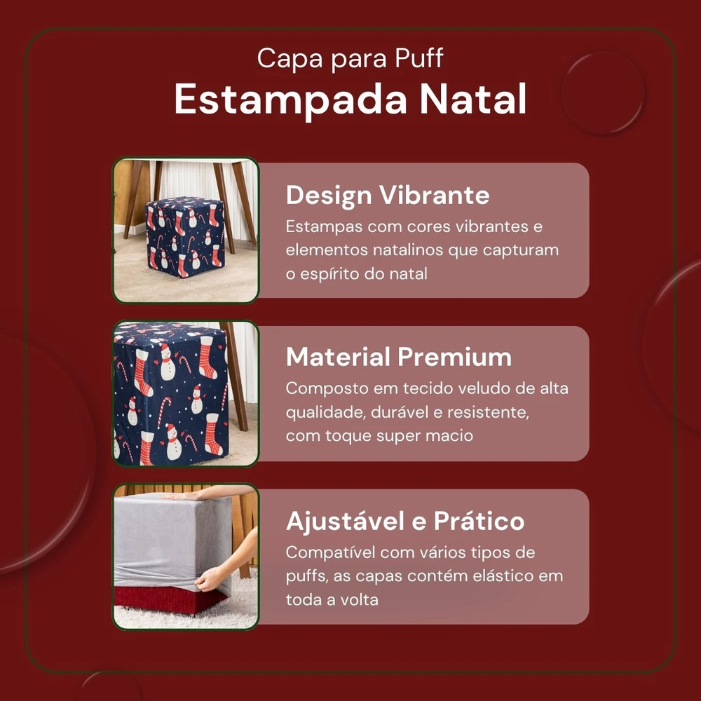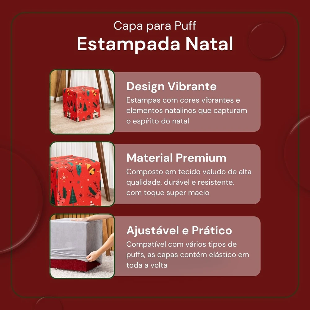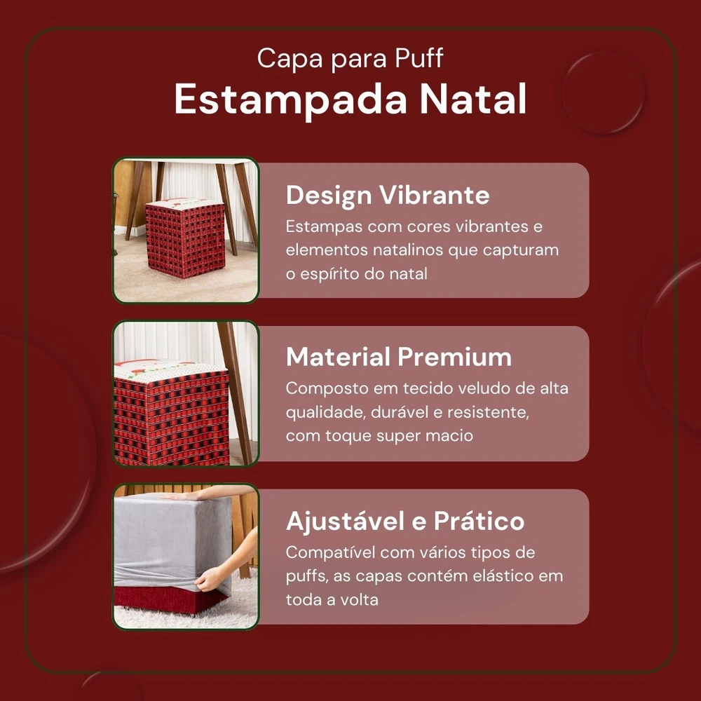 Transforme a decoração da sua casa neste Natal com nossa elegante capa de puff! Confeccionada em tecido veludo suede de alta qualidade, essa capa não só traz um toque sofisticado, mas também é super macia ao toque. A estampa natalina vibrante vai encantar sua família e amigos, criando um ambiente festivo e acolhedor. Com um design ajustável e prático, a capa se adapta facilmente ao seu puff, graças ao elástico que proporciona um encaixe perfeito. Ideal para proteger seu mobiliário e dar um novo visual ao seu espaço, ela é a solução perfeita para quem deseja renovar a decoração sem grandes esforços. Dê um charme especial ao seu banquinho e aproveite o espírito natalino com estilo! Perfeita para salas de estar, quartos ou qualquer canto da casa que mereça um toque festivo. Celebre esta época mágica com conforto e elegância!