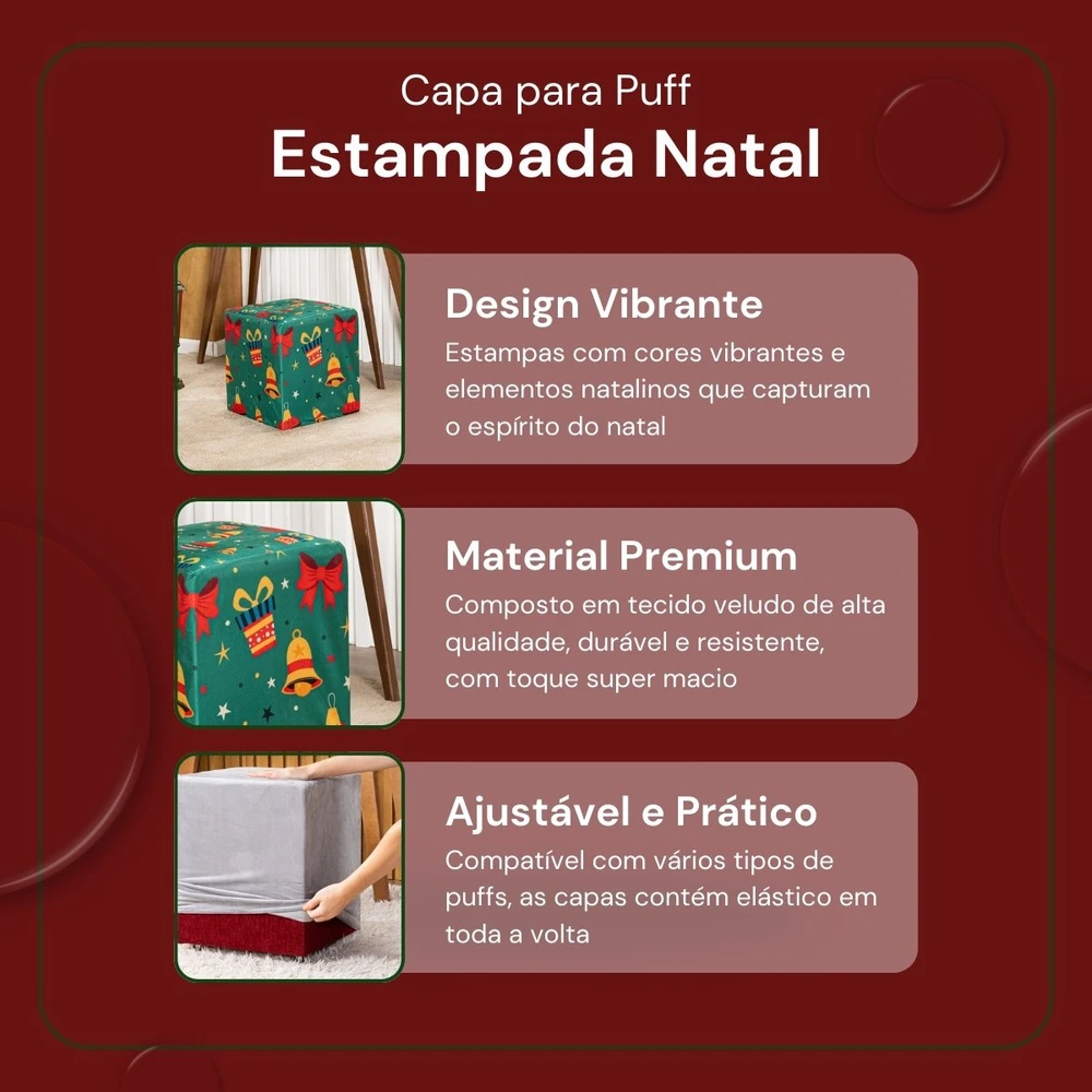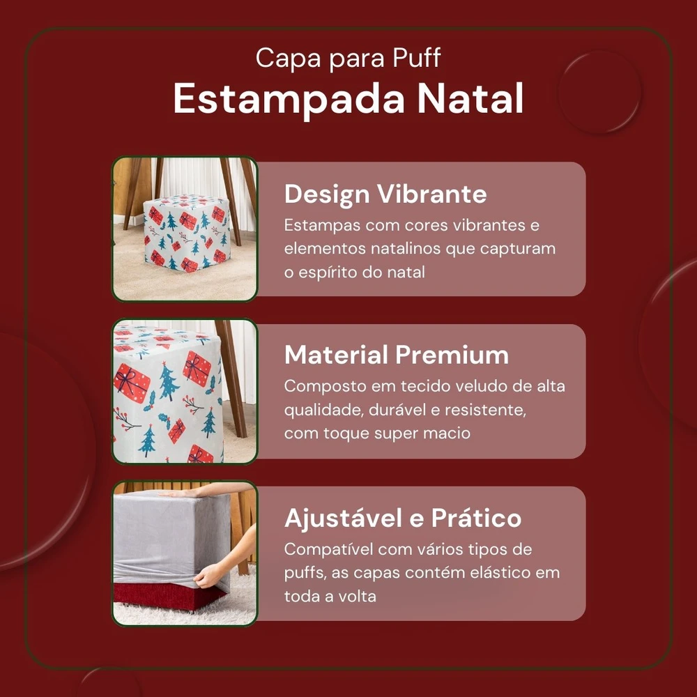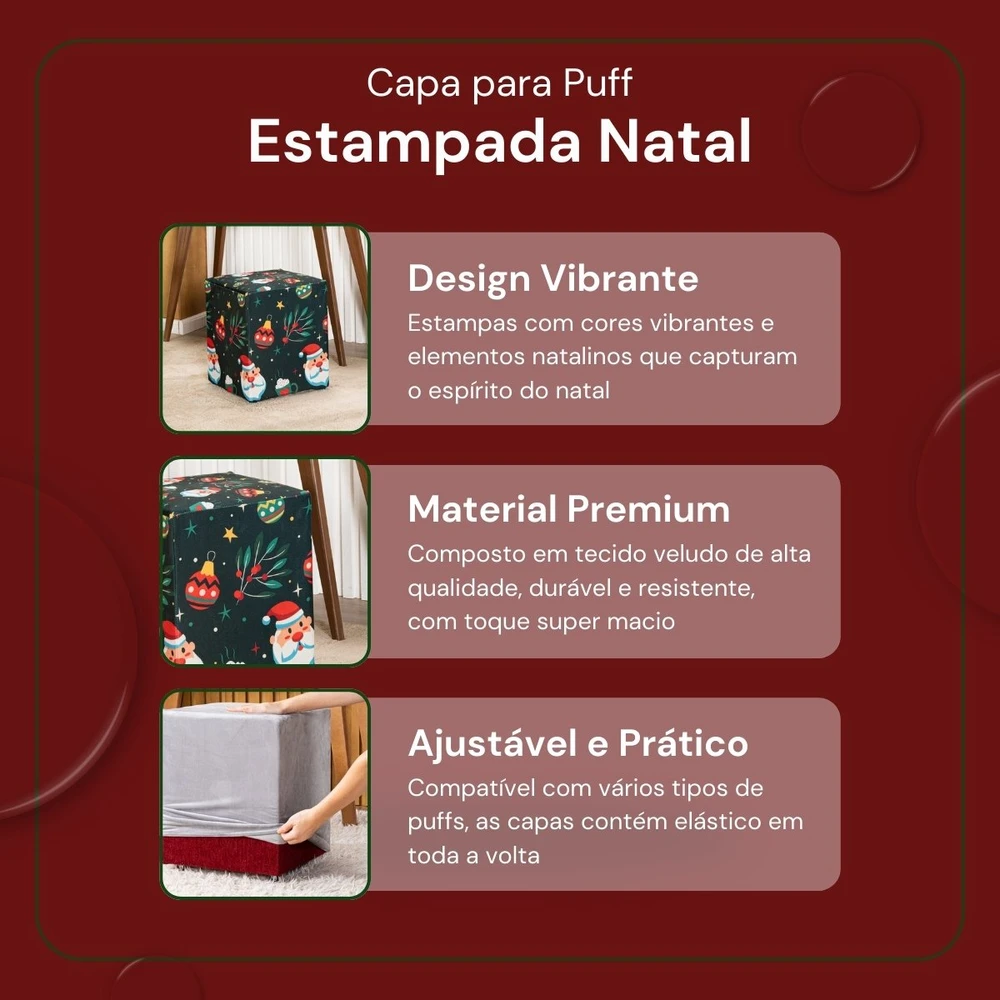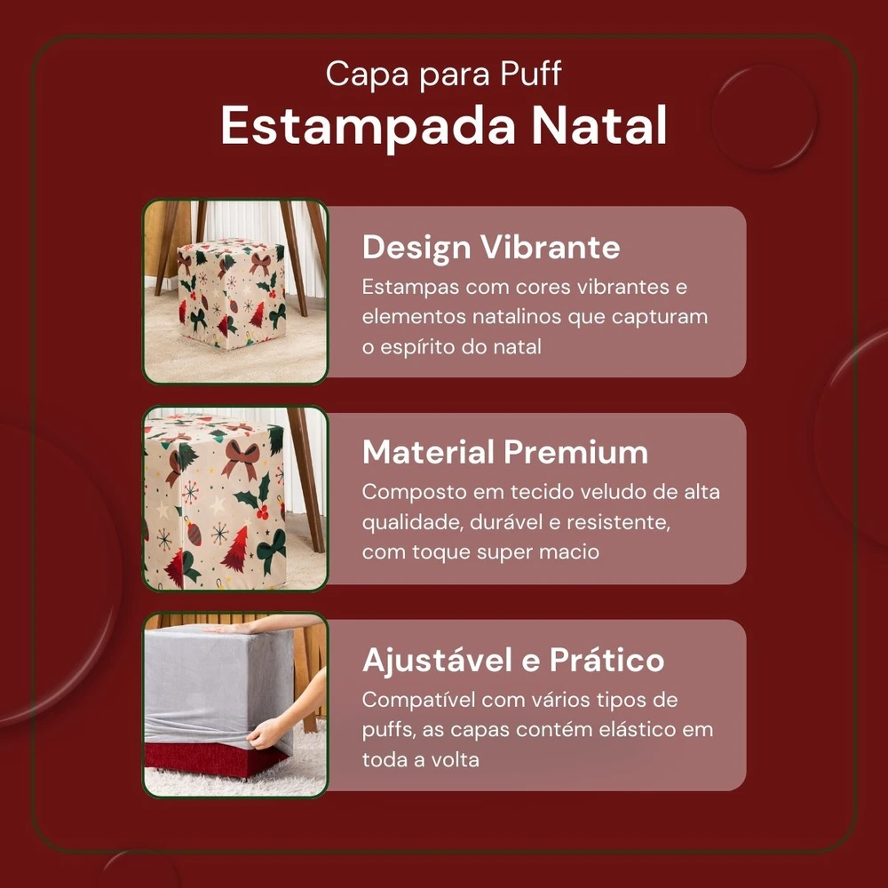 Transforme a decoração da sua casa neste Natal com nossa elegante capa de puff! Confeccionada em tecido veludo suede de alta qualidade, essa capa não só traz um toque sofisticado, mas também é super macia ao toque. A estampa natalina vibrante vai encantar sua família e amigos, criando um ambiente festivo e acolhedor. Com um design ajustável e prático, a capa se adapta facilmente ao seu puff, graças ao elástico que proporciona um encaixe perfeito. Ideal para proteger seu mobiliário e dar um novo visual ao seu espaço, ela é a solução perfeita para quem deseja renovar a decoração sem grandes esforços. Dê um charme especial ao seu banquinho e aproveite o espírito natalino com estilo! Perfeita para salas de estar, quartos ou qualquer canto da casa que mereça um toque festivo. Celebre esta época mágica com conforto e elegância!
