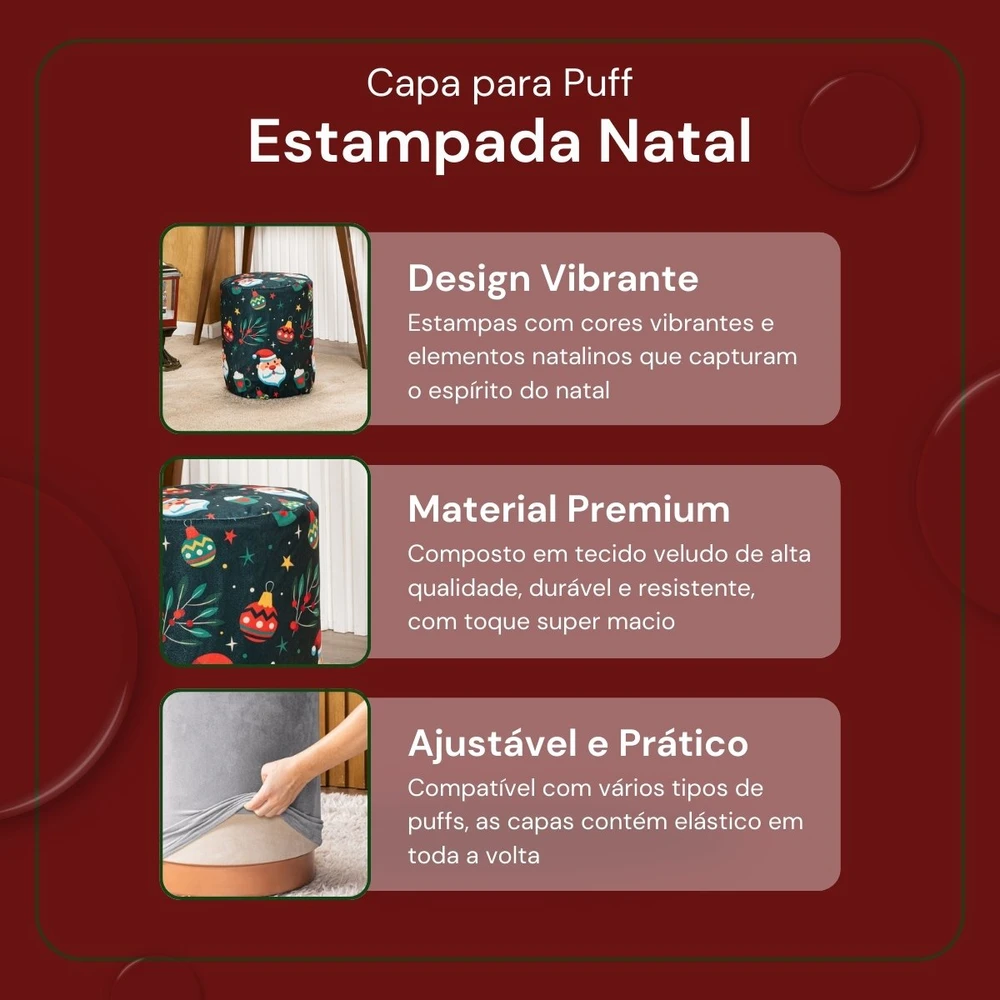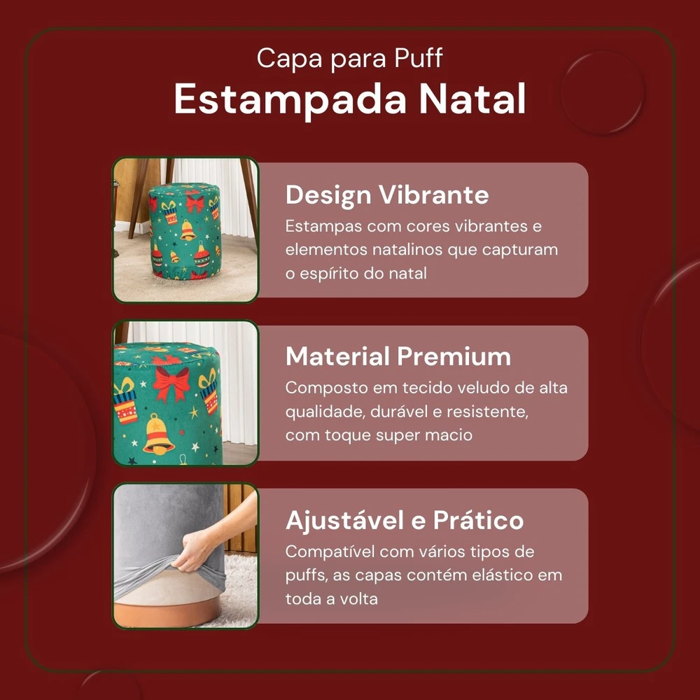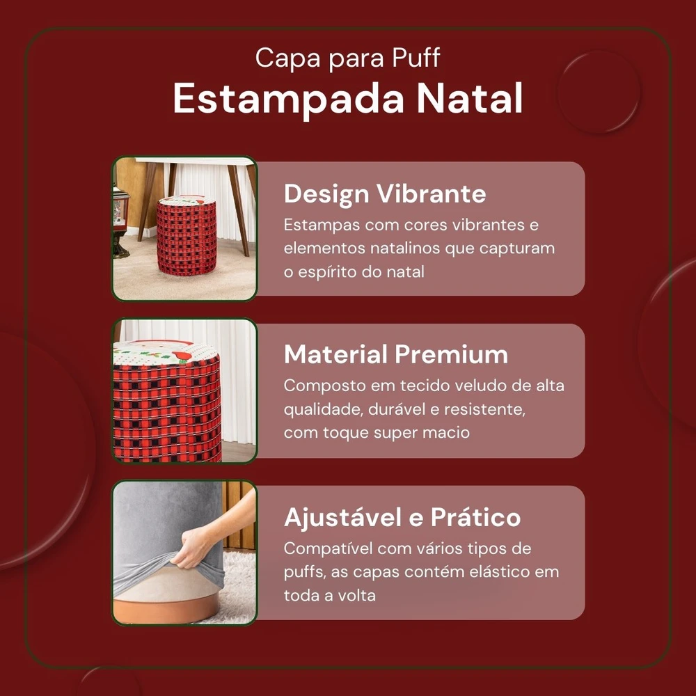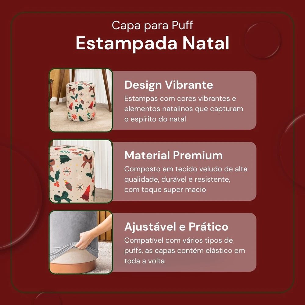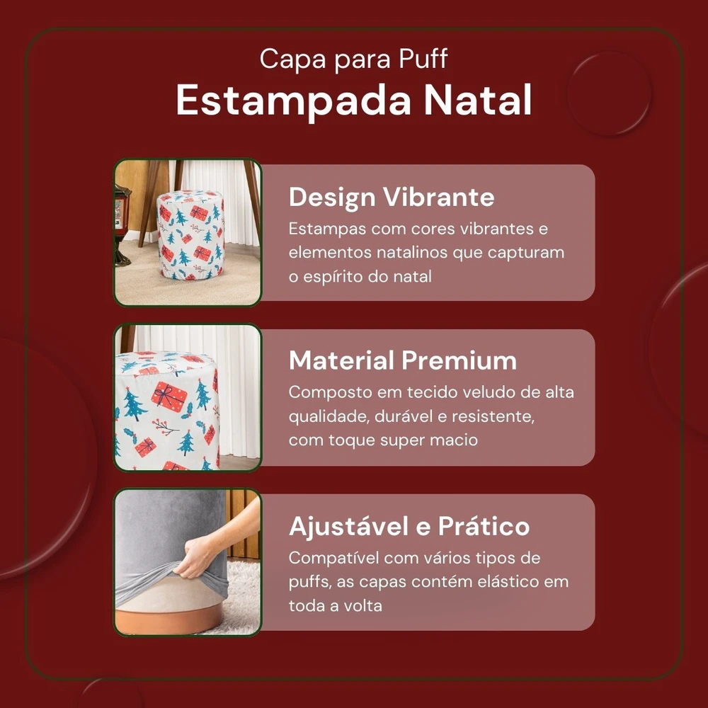 Transforme a decoração da sua casa neste Natal com nossa elegante capa de puff! Confeccionada em tecido veludo suede de alta qualidade, essa capa não só traz um toque sofisticado, mas também é super macia ao toque. A estampa natalina vibrante vai encantar sua família e amigos, criando um ambiente festivo e acolhedor. Com um design ajustável e prático, a capa se adapta facilmente ao seu puff, graças ao elástico que proporciona um encaixe perfeito. Ideal para proteger seu mobiliário e dar um novo visual ao seu espaço, ela é a solução perfeita para quem deseja renovar a decoração sem grandes esforços. Dê um charme especial ao seu banquinho e aproveite o espírito natalino com estilo! Perfeita para salas de estar, quartos ou qualquer canto da casa que mereça um toque festivo. Celebre esta época mágica com conforto e elegância!