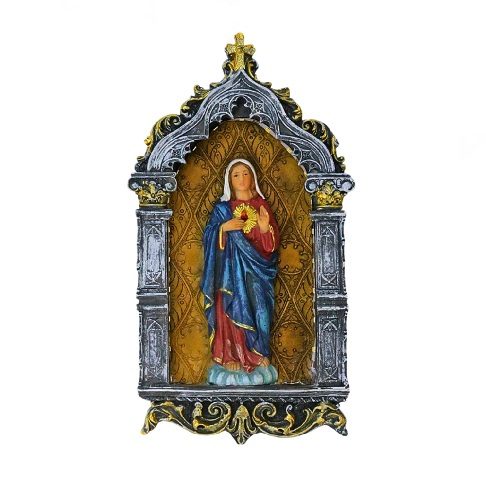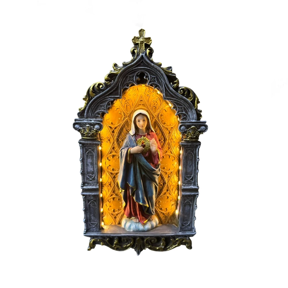um símbolo de devoção que une tradição e tecnologia. Com design detalhado e acabamento impecável, essa peça decorativa traz a imagem do Sagrado Coração de Maria em um nicho ornamentado, realçado por iluminação em LED que cria um ambiente acolhedor e espiritualizado. Ideal para oratórios, salas de estar ou espaços de meditação, oferece uma experiência visual única, destacando a presença divina no seu dia a dia.