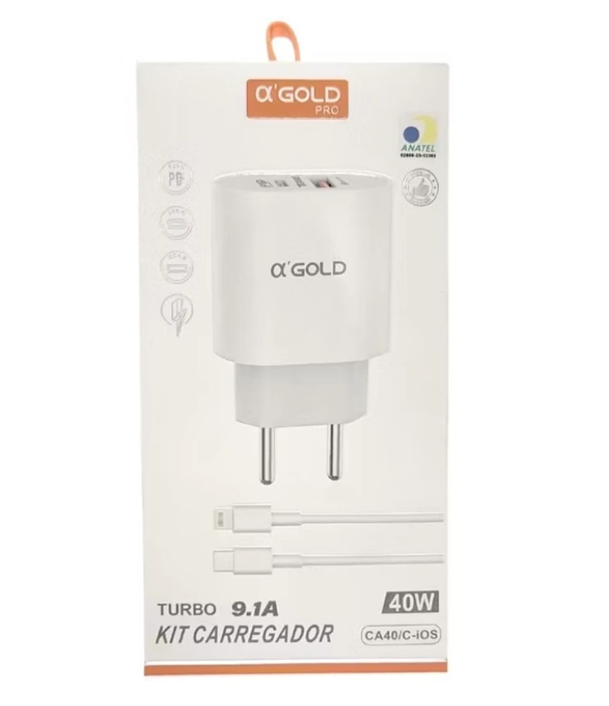O carregador A'Gold CA40-2 é um kit turbo de 40W e 9.1A, projetado para carregamento rápido (PD 3.0/QC 4.0) de iPhones com conector Lightning. Possui duas entradas (USB-C e USB-A), permitindo carregar dois dispositivos simultaneamente, e é homologado pela Anatel.