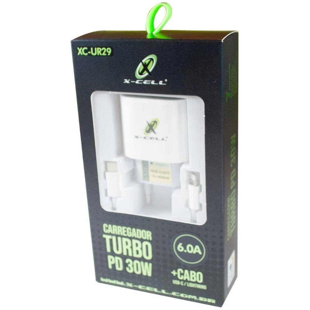 Carregador de Parede Turbo PD 30W X-CELL Flex com Cabo Lightning (1m)O Carregador de Parede X-CELL PD 30W 6.0 A é a solução definitiva para o carregamento ultra-rápido de seus dispositivos, especialmente aparelhos que utilizam a conexão Lightning (iPhone/iPad).A fonte conta com uma entrada USB-C (Type-C) equipada com a tecnologia Power Delivery (PD), que é capaz de identificar a quantidade de carga necessária pelo dispositivo conectado, eliminando riscos de sobrecarregar ou danificar a bateria ou o aparelho.Este kit é ideal para quem busca velocidade e segurança.Principais Características:- Tecnologia: Power Delivery (PD) 30W.- Corrente de Saída Máxima: 6.0A (Ultra-Rápido).- Porta: 1 Porta USB-C (Type-C).- Compatibilidade da Fonte: Dispositivos compatíveis com carregamento USB-C.- Cabo Incluso: Cabo USB-C x Lightning 8P (1 metro).- Voltagem: Bivolt (Uso universal).Benefícios do Produto:- Carregamento Turbo (PD): Recarrega a bateria de forma extremamente rápida, economizando seu tempo.- Segurança Inteligente: A tecnologia PD identifica a carga ideal para o dispositivo, prevenindo danos.- Compatibilidade Apple: Acompanha o cabo USB-C para Lightning, ideal para iPhones e iPads.- Qualidade e Durabilidade: Design robusto e materiais de alta qualidade (Ótima qualidade garantida).Item Incluso:- 1 Carregador de Parede Turbo PD 30W com 1 Porta USB-C.- 1 Cabo de Carregamento e Dados USB-C x Lightning (1 metro).Garantia e Segurança:- Ótima qualidade: Feita com materiais de alta qualidade, essa produto é construída para durar. Você pode confiar na sua durabilidade e resistência.- Produto novo: Todos os nossos produtos são novos e nunca foram usados. Tenha a certeza de que está recebendo um produto em perfeitas condições.- Com nota fiscal: Para sua segurança e tranquilidade, todos os nossos produtos vêm acompanhados de nota fiscal.- ENVIAMOS PARA TODO BRASIL- Compra 100% segura.- ATENDIMENTO PRÉ COMPRA E PÓS COMPRAAtributos do ProdutoCategoria: "Eletrônicos, Áudio e Vídeo / Acessórios para Celulares / Carregadores e Cabos"Título do Produto: Carregador Turbo PD 30W USB-C Flex C/ Cabo Lightning 1m iPhone iPad 6.0A BivoltEAN: 7908417101132Marca: FLEXDescrição do Produto: não aplicaImagem 1: não aplicaSku: 7908417101132Peso: 0,075 kgAltura: 3 cmLargura: 9 cmComprimento: 16,5 cmProduto: Carregador Celular de Parede Turbo PD USB-CMetragem por Embalagem: não aplicaCor: não aplicaGarantia do Fabricante: Não InformadoTipo: Carregador de Parede Turbo (PD) + CaboIdentificação de Chamadas: não aplicaAcompanha Ramal: não aplicaViva-Voz: não aplicaReferência do Produto: XC-UR29Modelo do carregador: XC-UR29Tipos de conectores do cabo: USB-C e Lightning 8P