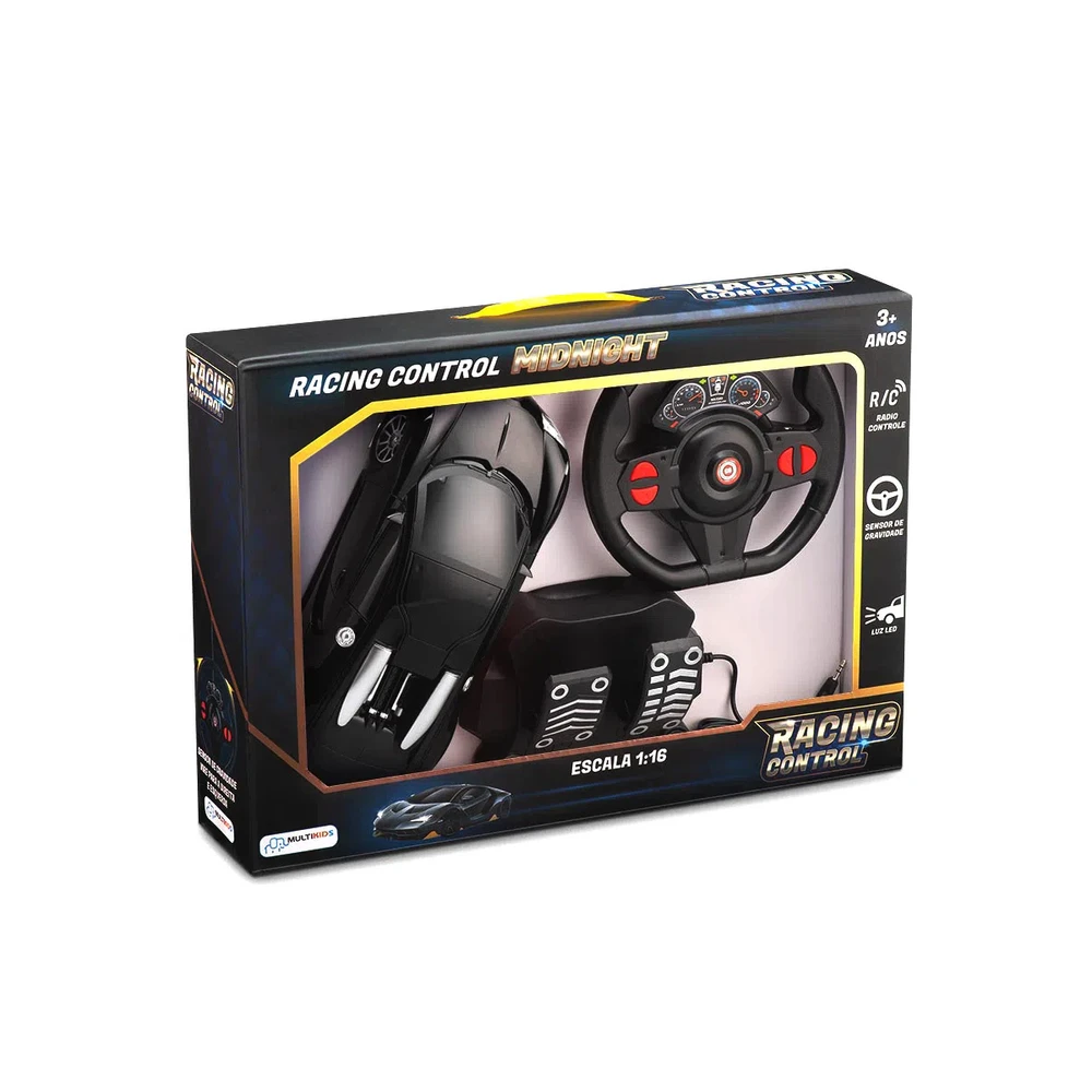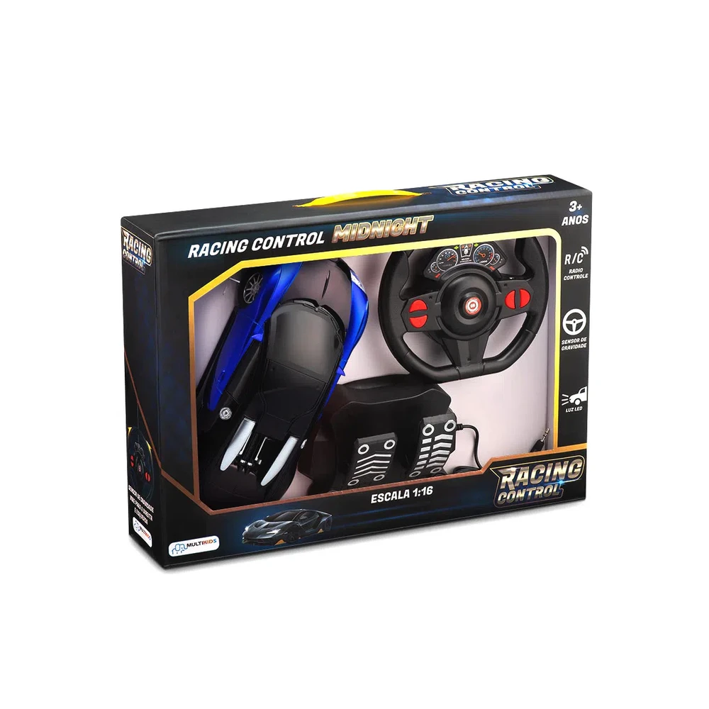 Acelere para valer com Racing Control!Simule a experiência de dirigir um carro de verdade.Possui pedais para aceleração e o controle remoto é em formato de volante, com sensor de gravidade para movimentação direita e esquerda.Alcança distância de até 10 metros em escala 1:16, fio de pedal com 1 metro e 40 centímetros.O carrinho possui luz de LED que acendem os faróis, com Racing Control da Multikids a diversão é garantida!Carrinho alimentado por 4 pilhas AA e controle alimentado por 2 pilhas AA*.*Pilhas não inclusas*