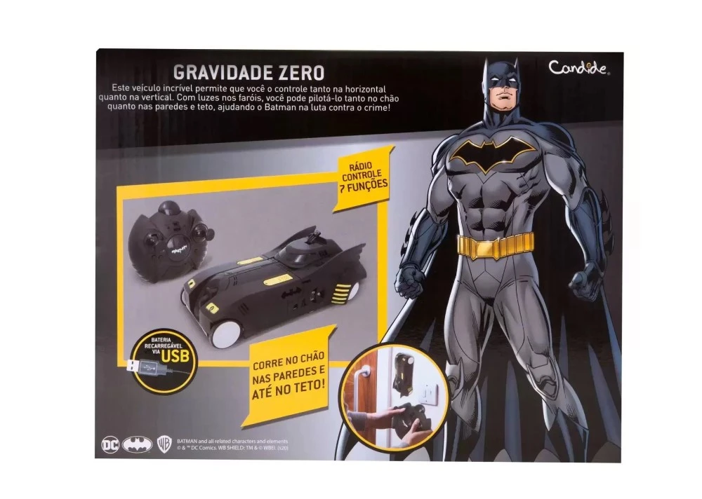 Carrinho de Controle Remoto Batman - Gravidade Zero 7 Funções ? Anda chão, Paredes e Teto - Candide É muito divertido brincar com carrinhos, e os modelos com controle remoto são um dos preferidos das crianças. Com o carrinho de controle remoto Batman Gravidade Zero da Candide a diversão está garantida! Acelere em uma animada diversão com o Batmóvel preto, super misterioso com sete funções que anda na parede e até no teto! Inspirado em uma das brincadeiras favoritas da criançada, ele utiliza pilhas e é certificado pelo INMETRO. Indicado para andar em ambientes secos e livres de sujeira, os pequenos podem levar para viagens e outros passeios e ter a brincadeira ao alcance das mãos. Idade acima de 4 anos Contem 1 carrinho 1 controle remoto Utiliza 2 Pilhas (não inclusas para o controle) - Bateria recarregável via USB Inclusa Tamanho embalagem 27 x 21 x 8 cm Fabricante Candide