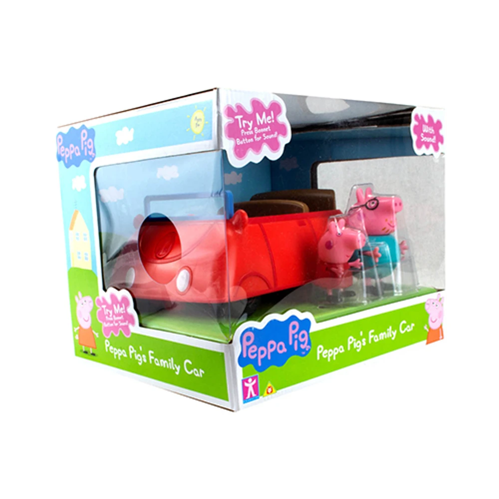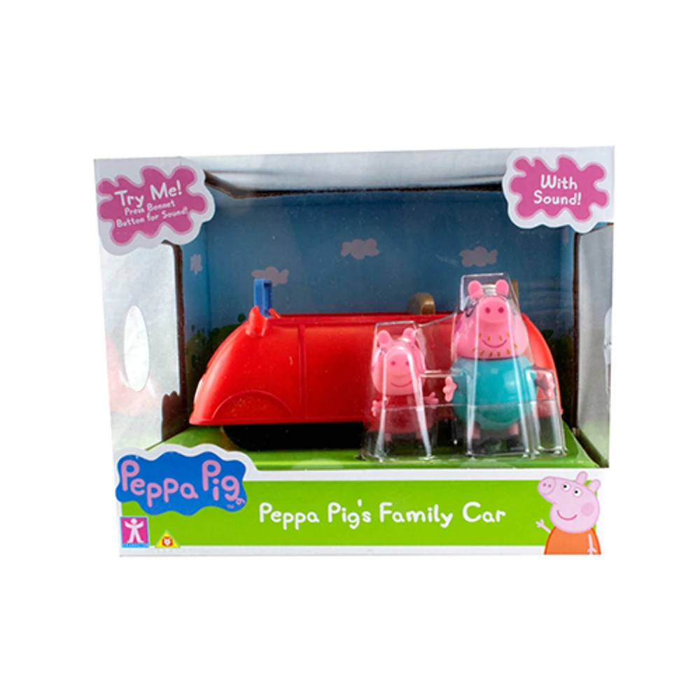 Carro oficial da família Pig! Emite som e vem com duas figuras articuladas exclusivas do Papai Pig e da Peppa Pig. Empurre o carro de roda livre para andar e aperte o botão no capô para escutar o som.