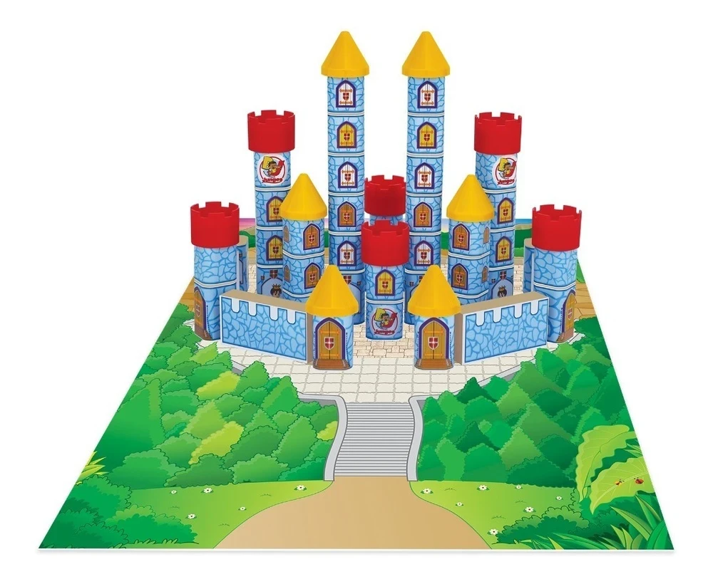 Conteúdo da embalagem: base em papel cartonado, bloquinhos de madeira, peças plásticas para torres e telhados e cartela de adesivos decorativos