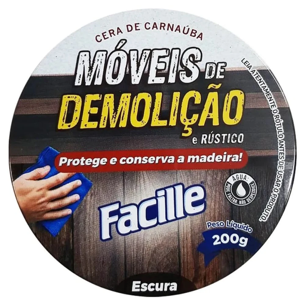 Cera de Carnaúba para Móveis de Demolição e Rústico 200g O produto é composto por matérias primas naturais, tendo como base a cera de carnaúba que cria uma camada protetora conservando o aspecto natural da madeira por mais tempo. Fácil aplicação e efeito prolongado contra manchas de líquidos, chuvas, excesso de exposição ao sol e risco em geral