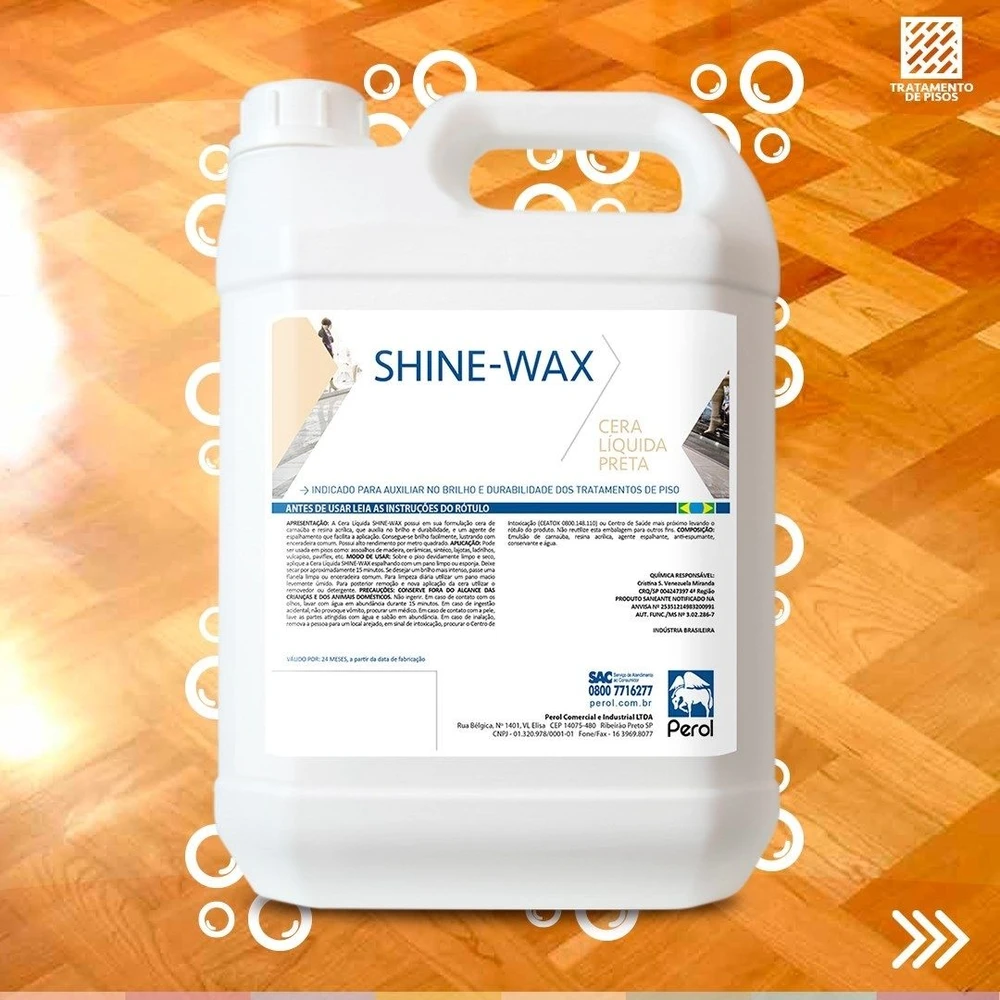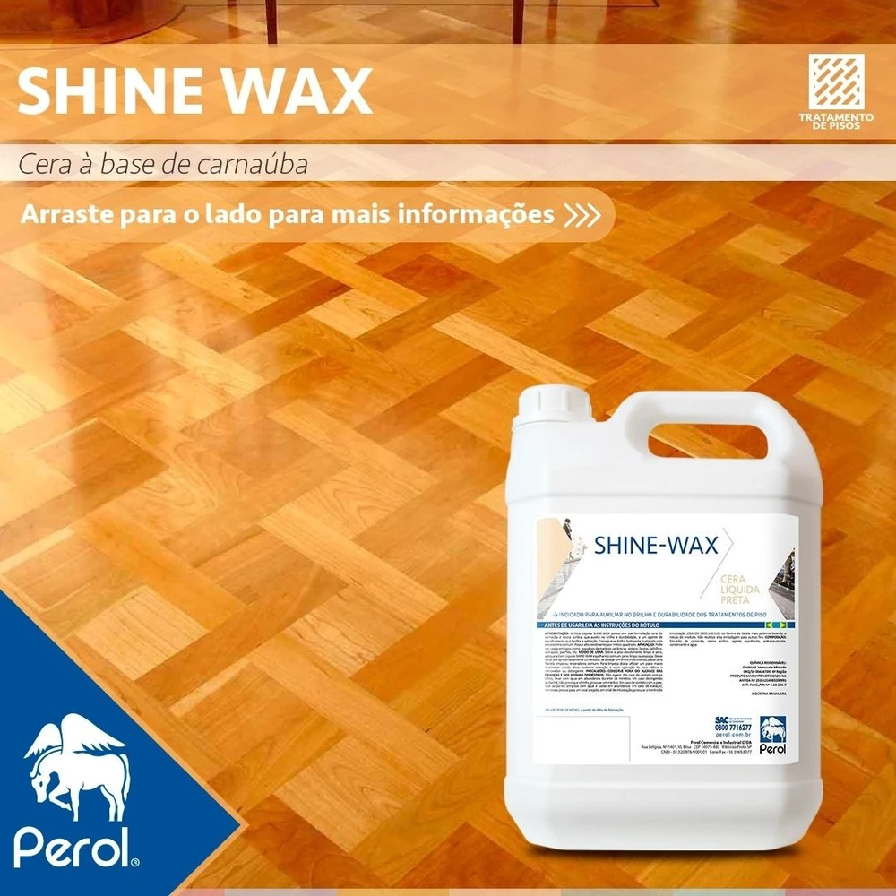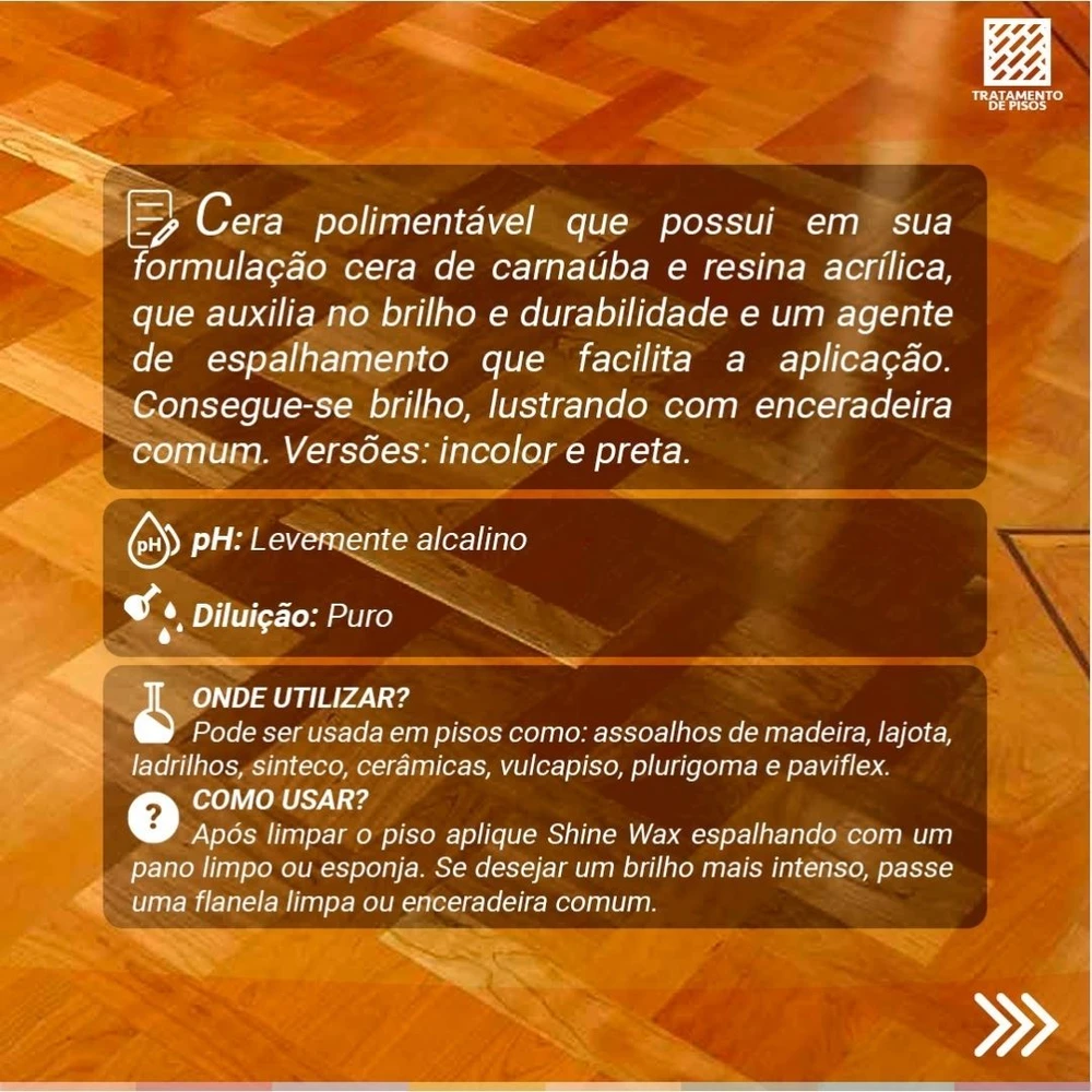 Após limpar o piso aplique Shine Wax espalhando com um pano limpo ou esponja. Se desejar um brilho mais intenso, passe uma flanela limpa ou enceradeira comum.