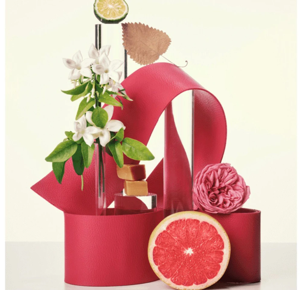 - Design do frasco exclusivo com detalhes em couro vermelho, símbolo de luxo e estilo