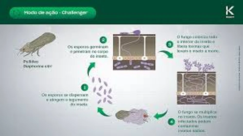 O inseticida microbiológico Challenger é um fungo entomopatogênico, que atua sobre diferentes estágios de desenvolvimento dos hospedeiros, como larvas, ninfas, pupas e adultos.