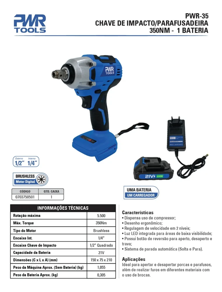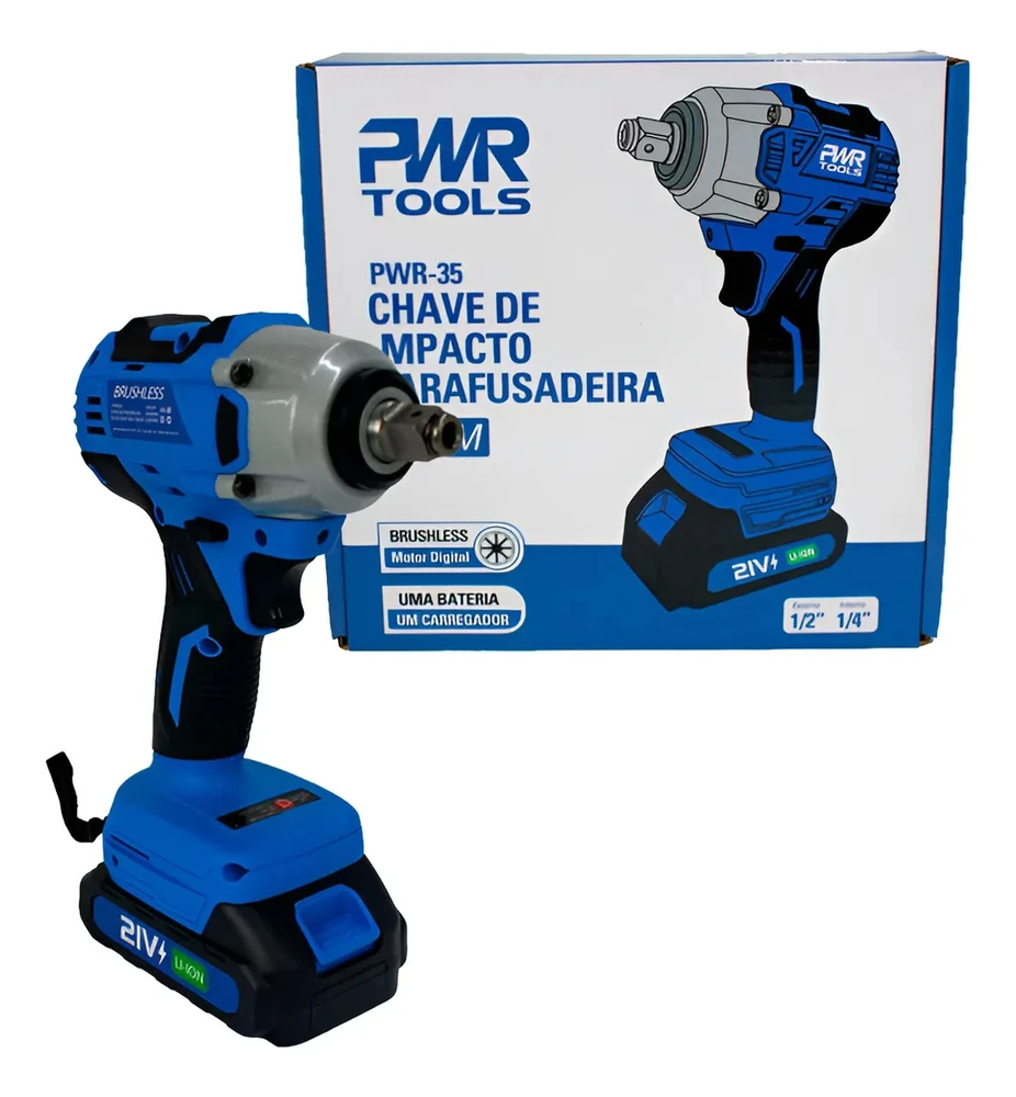 Essa chave de impacto foi projetada para quem trabalha com robustez: construção civil, montagem metálica, manutenção pesada e oficinas automotivas. Se você sente falta de força, versatilidade ou autonomia, a PWR-35 resolve: torque expressivo, operação sem compressor, a bateria recarregável libera mobilidade. O motor brushless prolonga vida útil, gera menos calor e menor manutenção. A luz LED integrada ajuda em áreas pouco iluminadas; o botão de reversão e sistema de parada automática oferecem controle preciso durante apertos e desapertos.