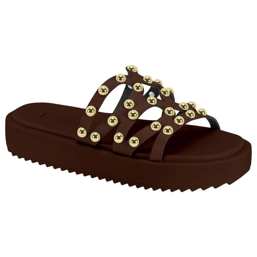 Confeccionado em material sintético, o Chinelo Flatform Moleca conta com tiras no cabedal adornadas com apliques metalizados.