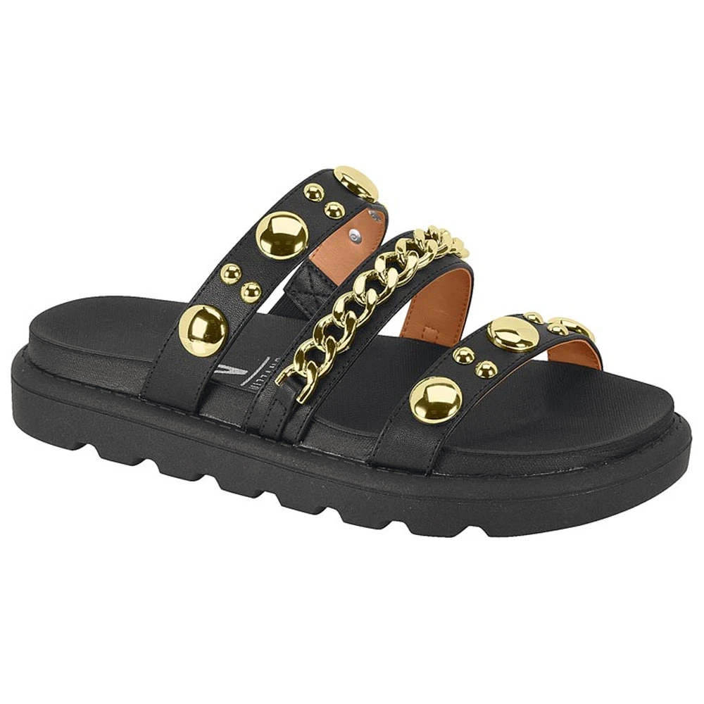 Confeccionado em material sintético, o Chinelo Tratorado Vizzano conta com múltiplas tiras com adornos metálicos.