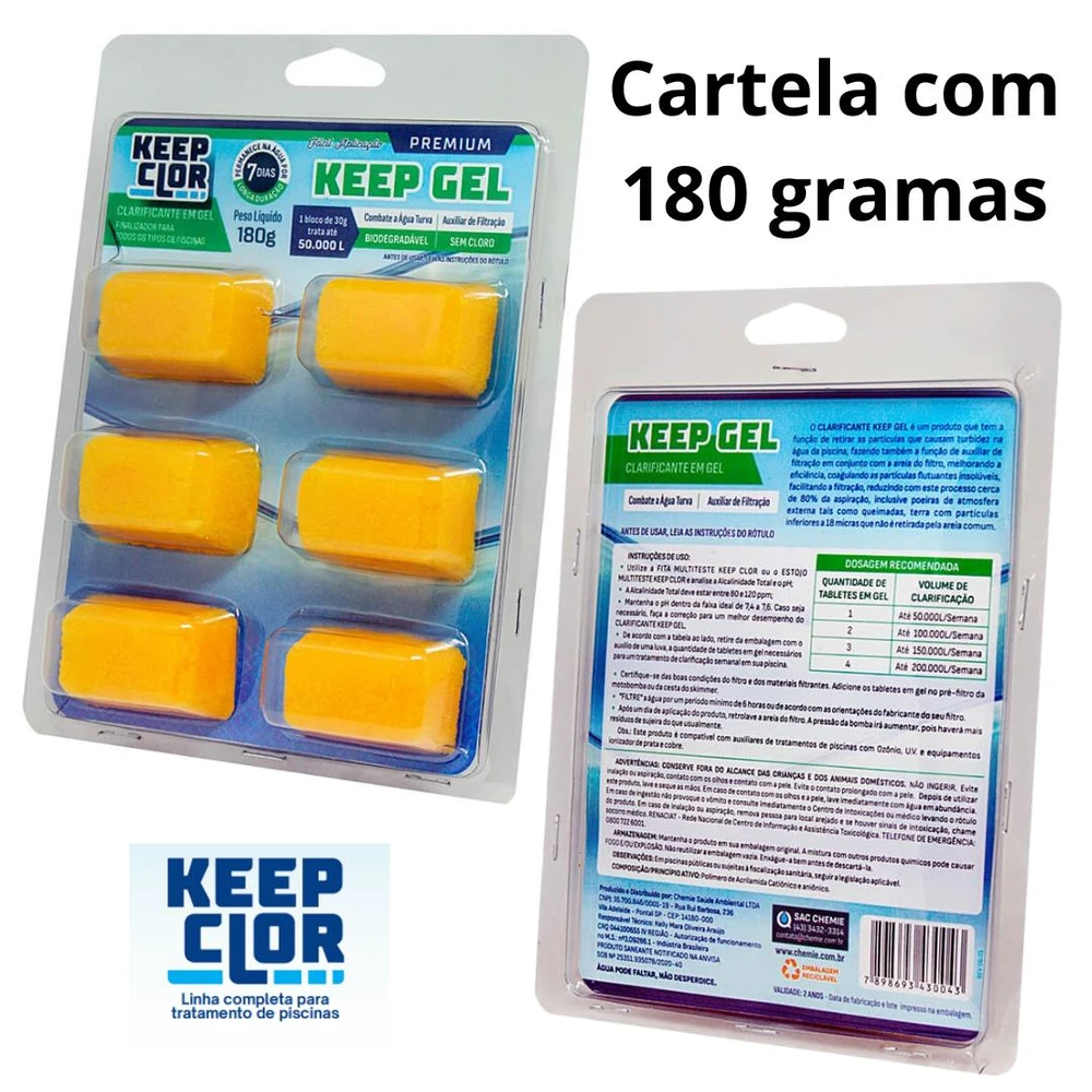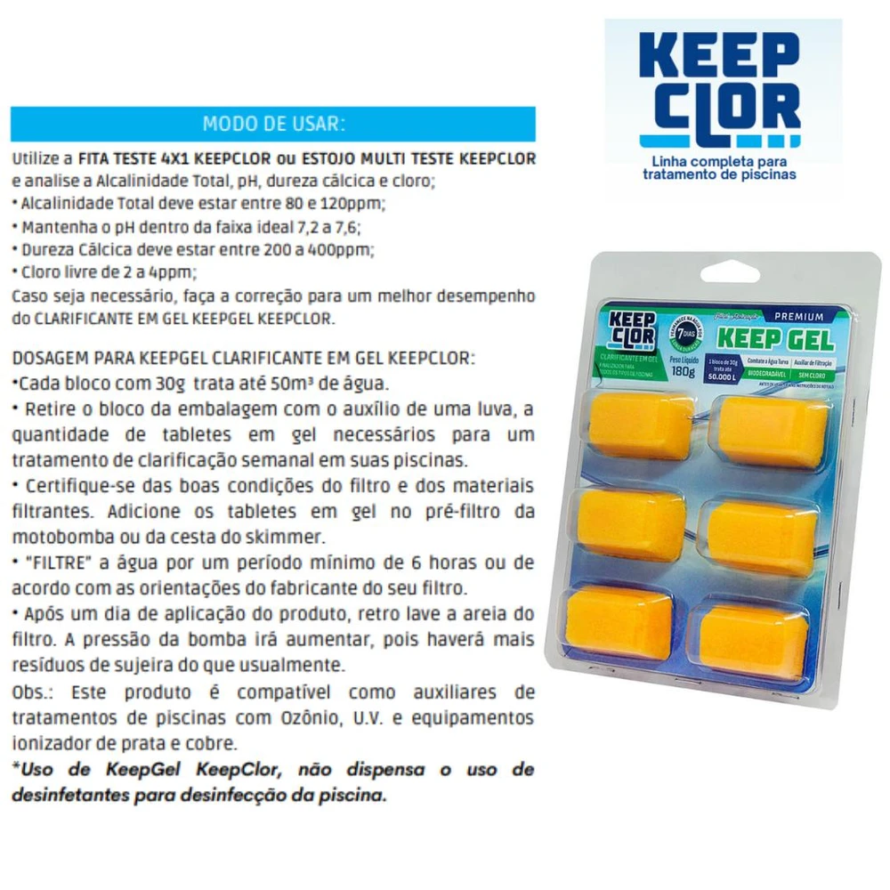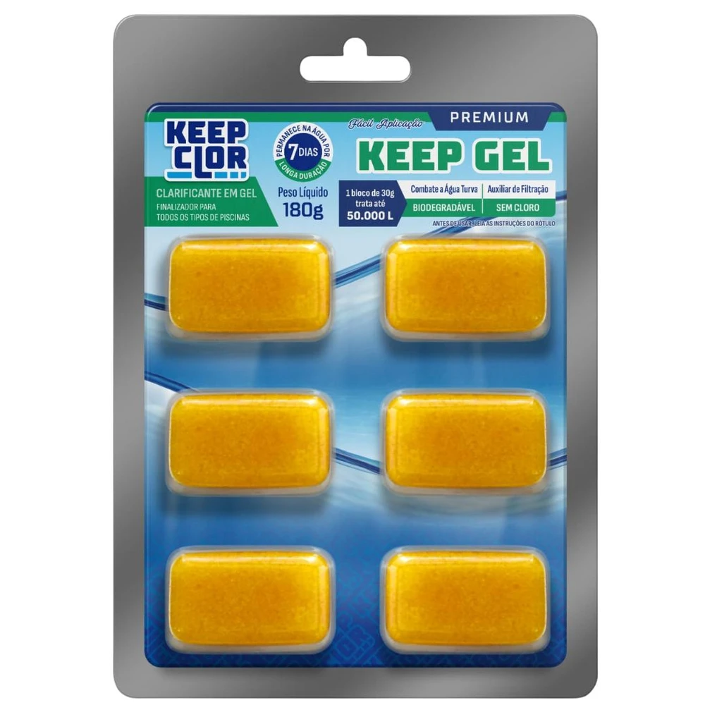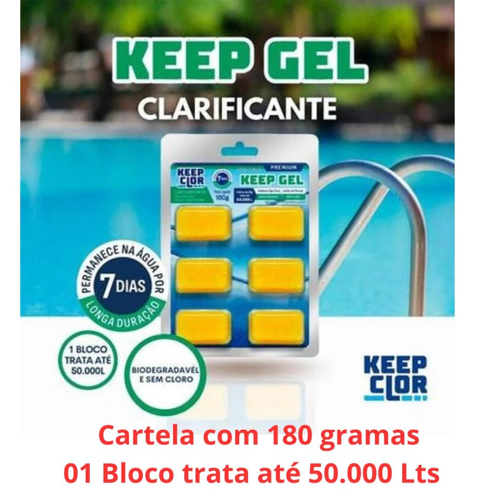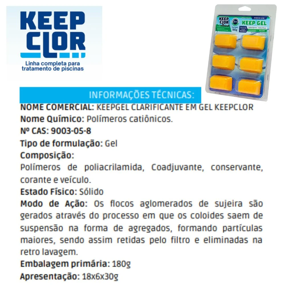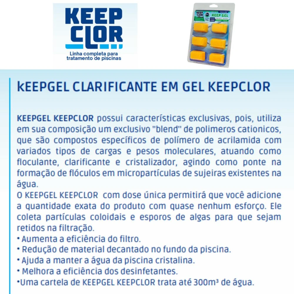 O CLARIFICANTE KEEP GEL É UM PRODUTO QUE TEM A FUNÇÃO DE RETIRAR AS PARTÍCULAS QUE CAUSAM TURBIDEZ NA ÁGUA DA PISCINA, FAZENDO TAMBÉM A FUNÇÃO DE AUXILIAR DE FILTRAÇÃO EM CONJUNTO COM A ARIA DO FILTRO, MELHORANDO A EFICIÊNCIA, COAGULANDO AS PARTÍCULAS FLUTUANTES INSOLÚVEIS, FACILITANDO A FILTRAÇÃO, REDUZINDO COM ESTE PROCESSO CERCA DE 80% DA ASPIRAÇÃO, INCLUSIVE POEIRAS DE ATMOSFERA EXTERNA TAIS COMO QUEIMADAS, TERRA COM PARTÍCULAS INFERIORES A 2 MICRAS QUE NÃO É RETIRADA PELA AREIA COMUM.