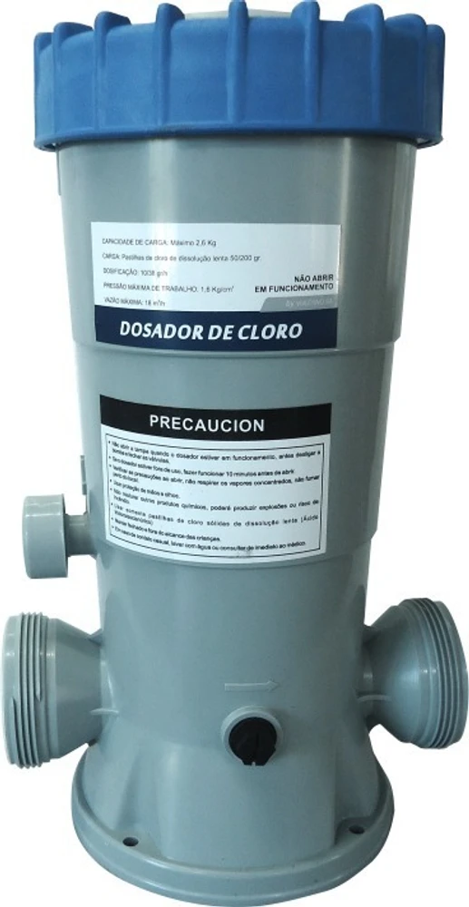 o clorador automatico é indicado para todos os tipos de piscina - spa - uso residencial e afins.Clorador automático projetado para instalação na linha de retorno da piscina ou do SPA, acima ou abaixo da linha d?água.Destina-se a utilização unicamente com tabletes ou pastilhas de cloro Tricloro-S-Triazina-triona de baixa dissolução.Tem capacidade máxima para até 2,6Kg de pastilhas, dispondo de uma válvula reguladora do fluxo de água.Quando a vazão da bomba for superior a 6.500 litros/hora, recomenda-se a instalação de ?by-pass? para livre passagem do volume de água que exceder essa quantidade. 1) Descrição do Produto:O dosador de cloro Netuno funciona em conjunto com a circulação de agua provida tanto por bomba de agua ou por gravidade, conectado em linha ao circuito de destino (caixa d?agua).Pela sua grande capacidade de carga e fácil manuseio da válvula de dosagem/controle de cloro, permite um serviço de dosagem durante várias semanas sem necessidade de recarga, conseguindo uma dispersão uniforme a todo volume de água e eficiente tratamento de desinfecção da agua.Funciona com pastilhas de cloro de dissolução lenta de 20 e 200 grs.2) Instalação:O dosador de cloro se instalará exclusivamente na linha de envio da agua até ao ponto de destino, depois do filtro, se tiver.A água deve fluir livremente sem nenhum outro artefato que interfira desde a saída do dosador até a caixa de agua.Instale com tubos de qualidade, mantenha o mesmo diâmetro de tubulação da saída do dosador até a caixa d?agua. Não utilize tubulação nem acessórios de cobre para sua instalação.O dosador se prenderá ao piso ou a uma base firme e nivelada de material não corrosivo, respeitando uma altura superior ao nível cheio da caixa para evitar que retorne cloro quando este não estiver funcionando.Se o dosador for instalado em casas ou pisos abaixo do nível d´água da caixa d?agua, deverá instalar registros de ?fechar e abrir/ By-Pass? antes e depois do dosador para poder realizar sua recarga.Para instalar verifique a flecha de sentido de fluxo.Faça as conexões de forma hermética e segura para evitar possíveis vazamentos de líquidos.Antes de carregar o dosador realize uma prova de funcionamento.3) Instruções de funcionamento:Utilizar um Kit Teste de Analise de Cloro.Regular a dosagem de cloro de acordo com sua necessidade.4) Operações de carga inicial:Desligar a motobomba e fechar os registros de entrada e saída do dosador.Abrir a tampa em sentido anti-horário e esvaziar o recipiente pelo tampão de drenagem.Carregar com pastilhas de cloro até no máximo de 2,6 kg sem comprimir. Fechar a drenagem e preencha com água até 2 cm da borda.Fechar a tampa corretamente controlando o estado da junta.Abrir ao máximo os registros de entrada e saída e ligar a motobomba.Abrir o registro de dosagem no ponto intermediário N° 4.A partir desta regulagem inicial, o usuário tomará mostras para analisar o teor de cloro até obter a dosagem necessária avançando ou retrocedendo a chave segundo a necessidade, para iguais períodos da motobomba.5) IMPORTANTE:-Usar somente pastilhas de cloro sólidas de 20 ou 200 grs.Não utilizar nem misturar diferentes produtos químicos.6) Operações de Recarga: Antes de abrir a tampa, fazer funcionar o dosador durante 10 minutos para evacuação de gases de cloro, se o mesmoesteve parado ou sem funcionar. Seguir os passos seguintes:Desligar a motobomba e fechar os registros de entrada e saída do aparelho.Afrouxar o tampão de drenagem para esvaziá-lo.Abrir a tampa lentamente, cuidando de não respirar os vapores de cloro em seu interior.Carregar com pastilhas de cloro até no máximo de 2,6 kg, sem comprimir, fechar o tampão de drenagem e encher com água o reservatório até 2 cm da borda.Fechar a tampa corretamente controlando que a junta esteja colocada.Abrir ao máximo as chaves de entrada e saída e ligar a motobomba.Verificar se a linha de retorno está aberta e livre para a recirculação.7) Precauções:Não abrir a tampa quando o dosador estiver em funcionamento, antes desligar a bomba e fechar os registros.Limite as precauções ao abri-lo, não fumar perto do dosador;Não respirar os vapores concentrados de cloro.Usar proteção de mãos, olhos e nariz.Não misturar diferentes tipos de produtos químicos, poderá produzir explosões ou risco de incêndio.É aconselhável que as tarefas de manuseio do dosador de cloro, sejam realizadaspor um adulto, para maior segurança da operação.Mantenha fechadas as embalagens e fora do alcance de crianças os produtos químicos que se utilizam na manutenção dapiscina.8) Benefícios do Produto: O Dosador de Cloro tem o objetivo de automatizar o tratamento químico da água com a dissolução controlada de cloro. O equipamento funciona sozinho, o que te deixa com uma maior liberdade. Esse produto espalha o produto de maneira homogênea na água, promovendo resultados mais eficazes.