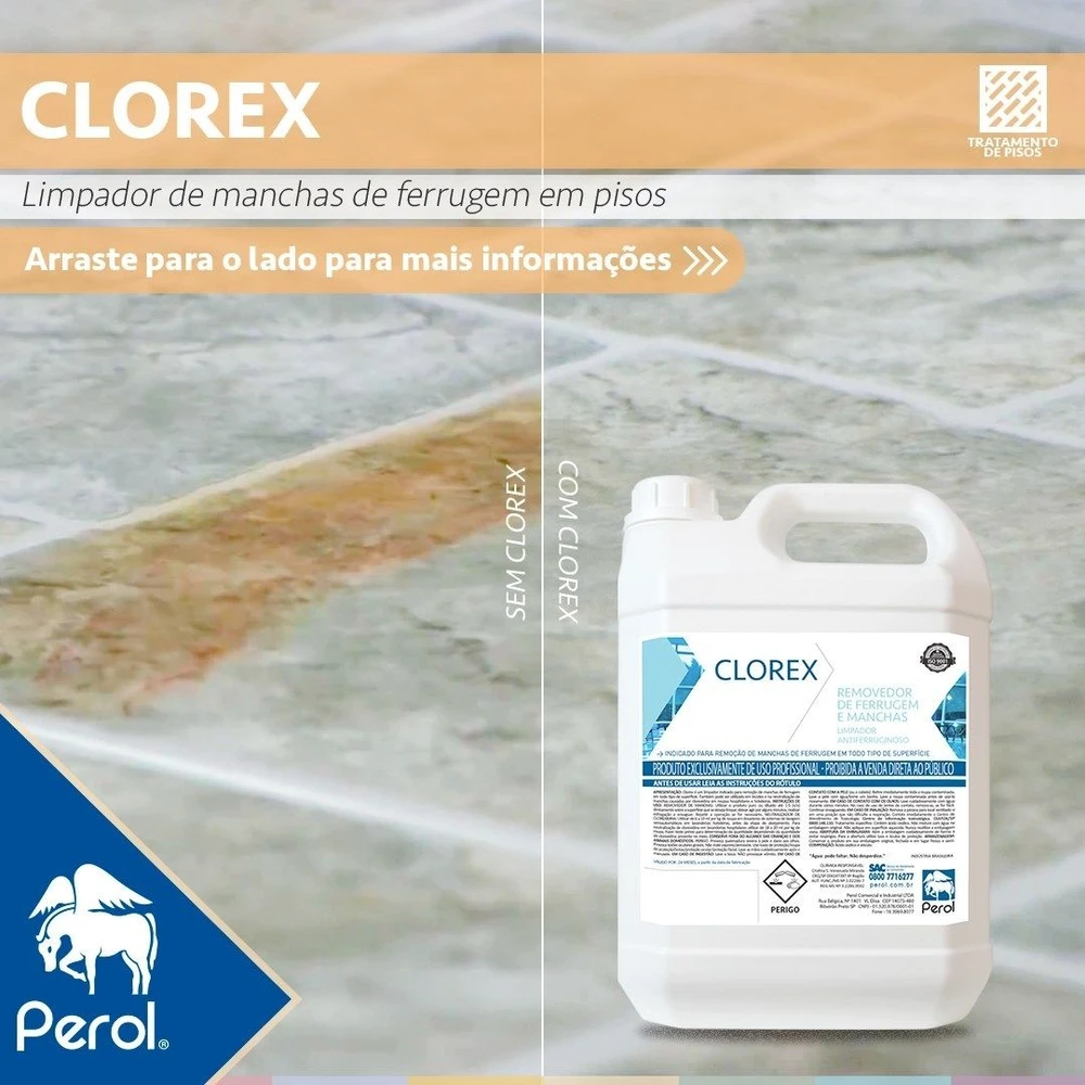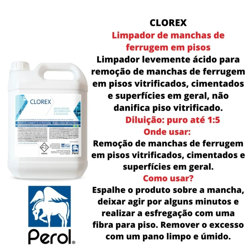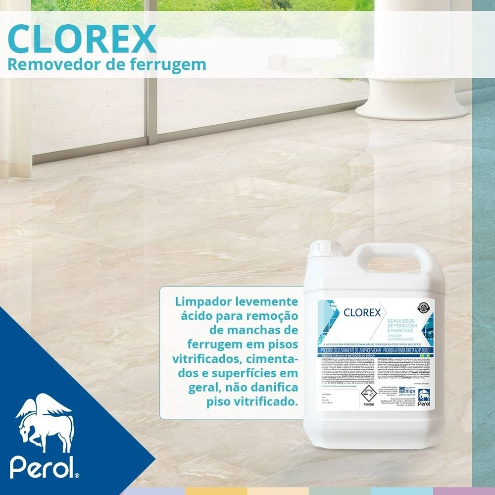 Clorex é um limpador levemente ácido para remoção de manchas de ferrugem em pisos vitrificados, cimentados e superfícies em geral, não danifica piso vitrificado.