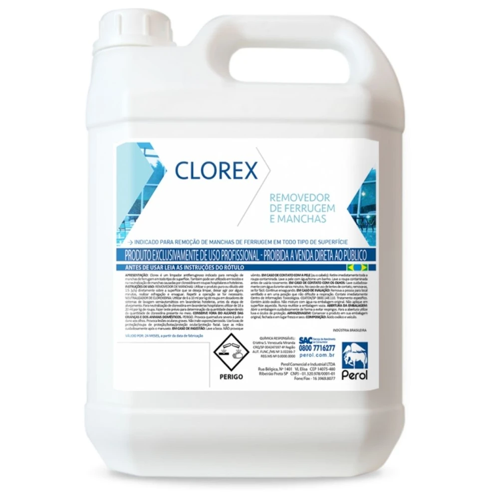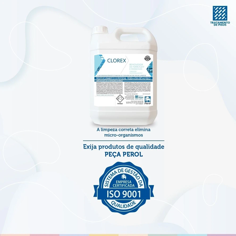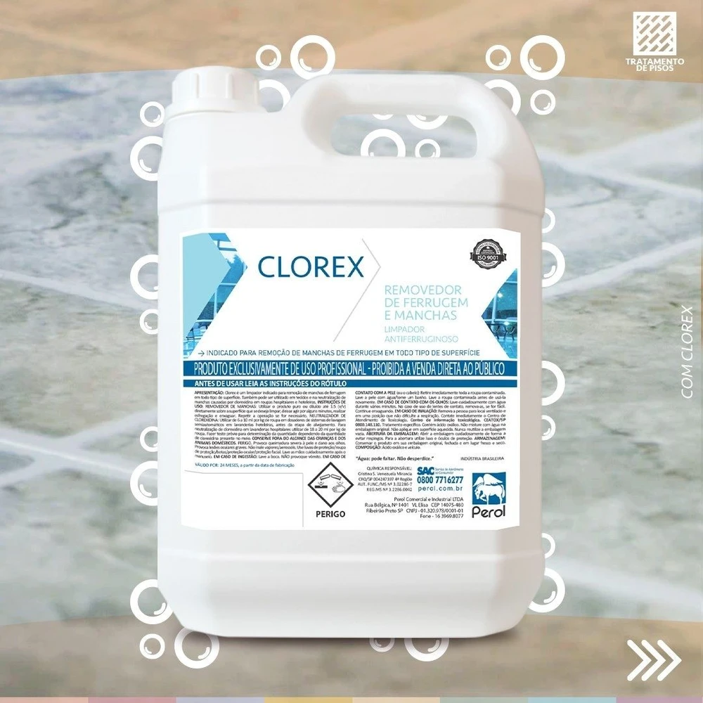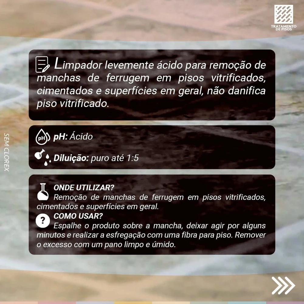 Clorex é um limpador levemente ácido para remoção de manchas de ferrugem em pisos vitrificados, cimentados e superfícies em geral, não danifica piso vitrificado.