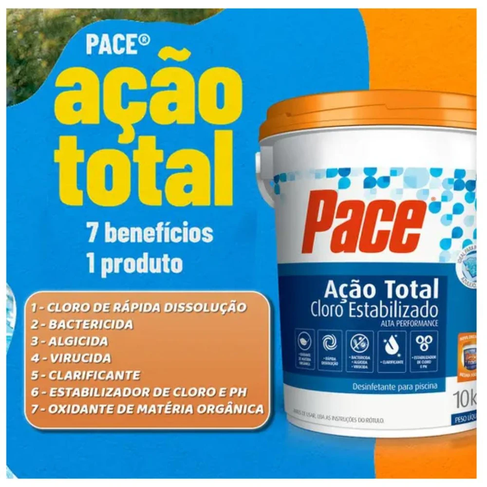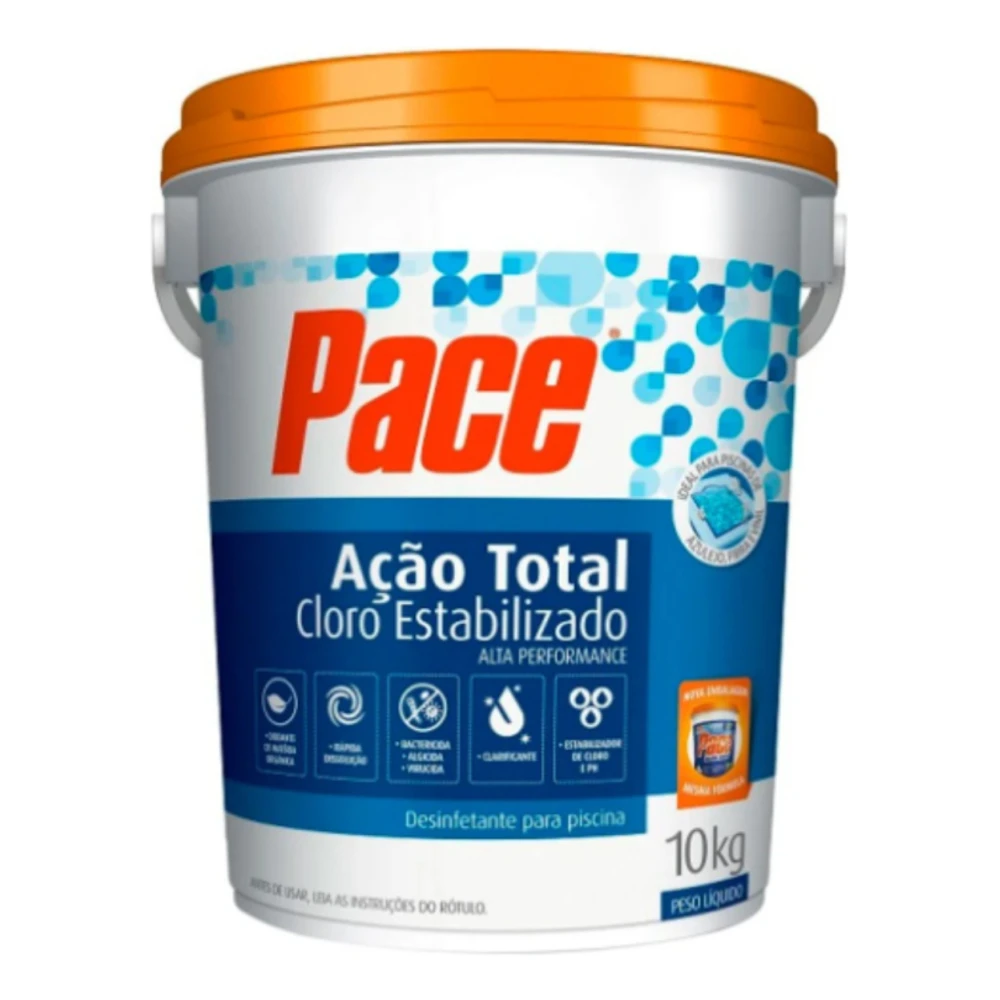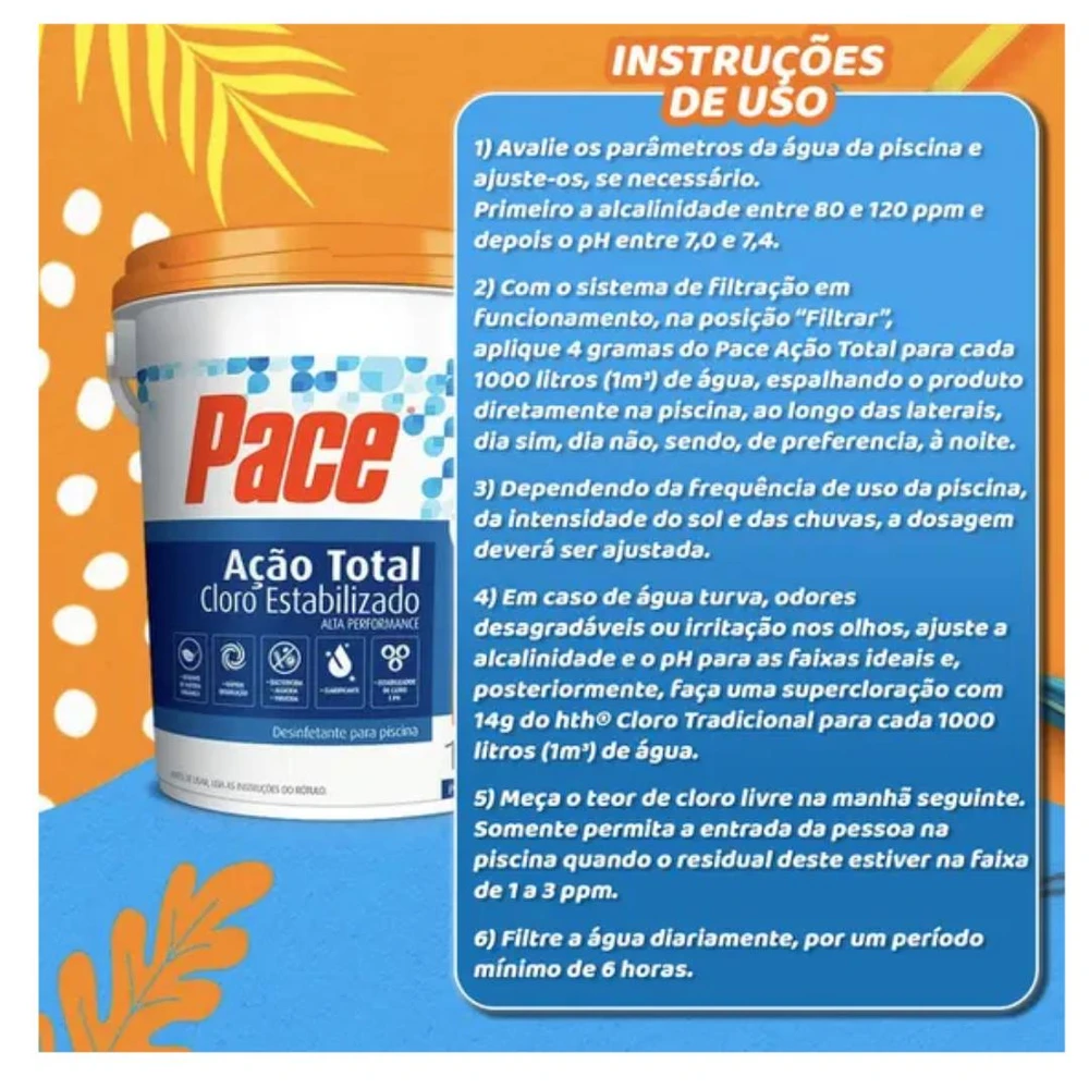 O Pace Ação Total é um cloro granulado estabilizado de alta performance, com ação virucida comprovada contra os vírus presentes na água, causadores de diarreia, vômito e febre. Um produto completo e eficaz, indicado para eliminar bactérias e oxidar matéria orgânica presente na água da piscina. Inibe odores desagradáveis e previne a transmissão de doenças infecciosas.