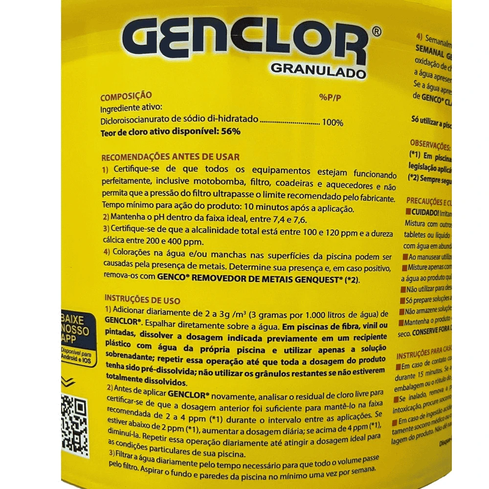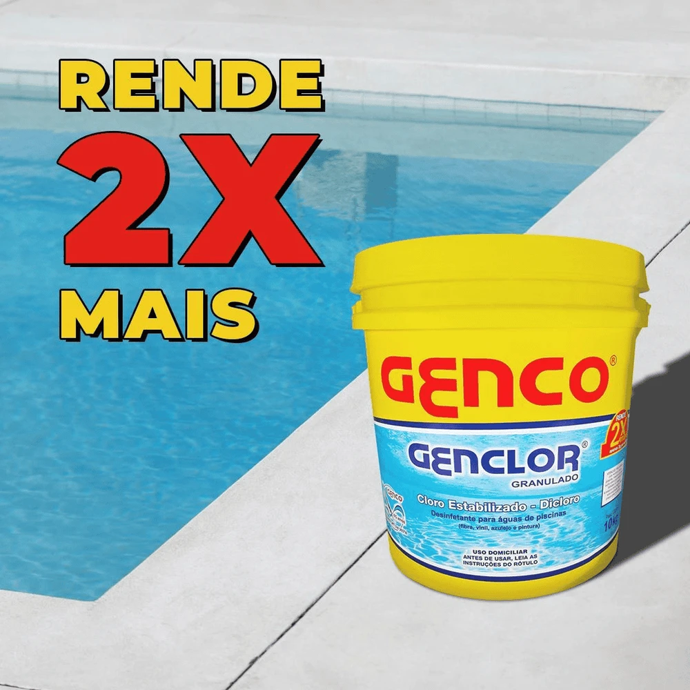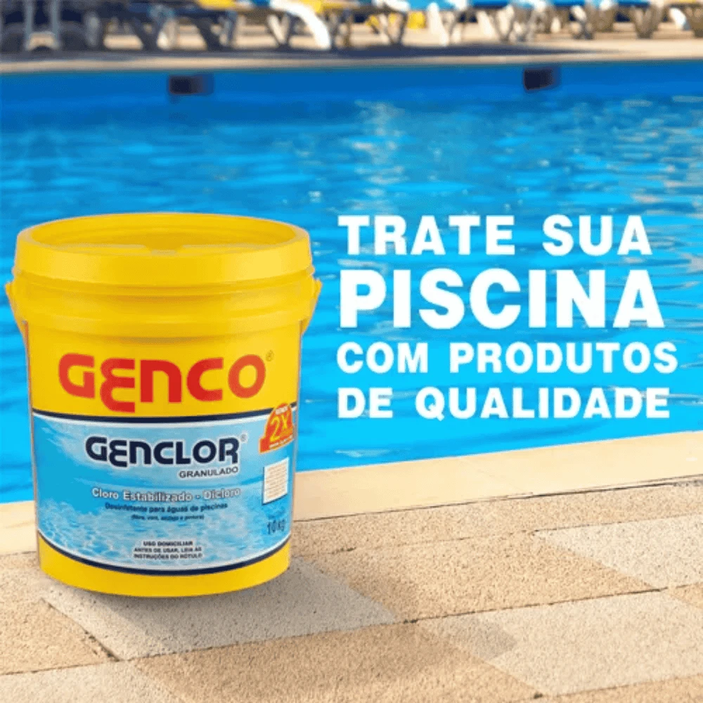 1) Adicionar diariamente de 2 a 3 g /m3 (3 gramas por 1.000 litros de água) de GENCLOR®. Espalhar diretamente sobre a água. Em piscinas de fibra, vinil ou pintadas, dissolver a dosagem indicada previamente em um recipiente plástico com água da própria piscina e utilizar apenas a solução sobrenadante; repetir essa operação até que toda a dosagem do produto tenha sido pré-dissolvida; não utilizar os grânulos restantes se não estiverem totalmente dissolvidos.
