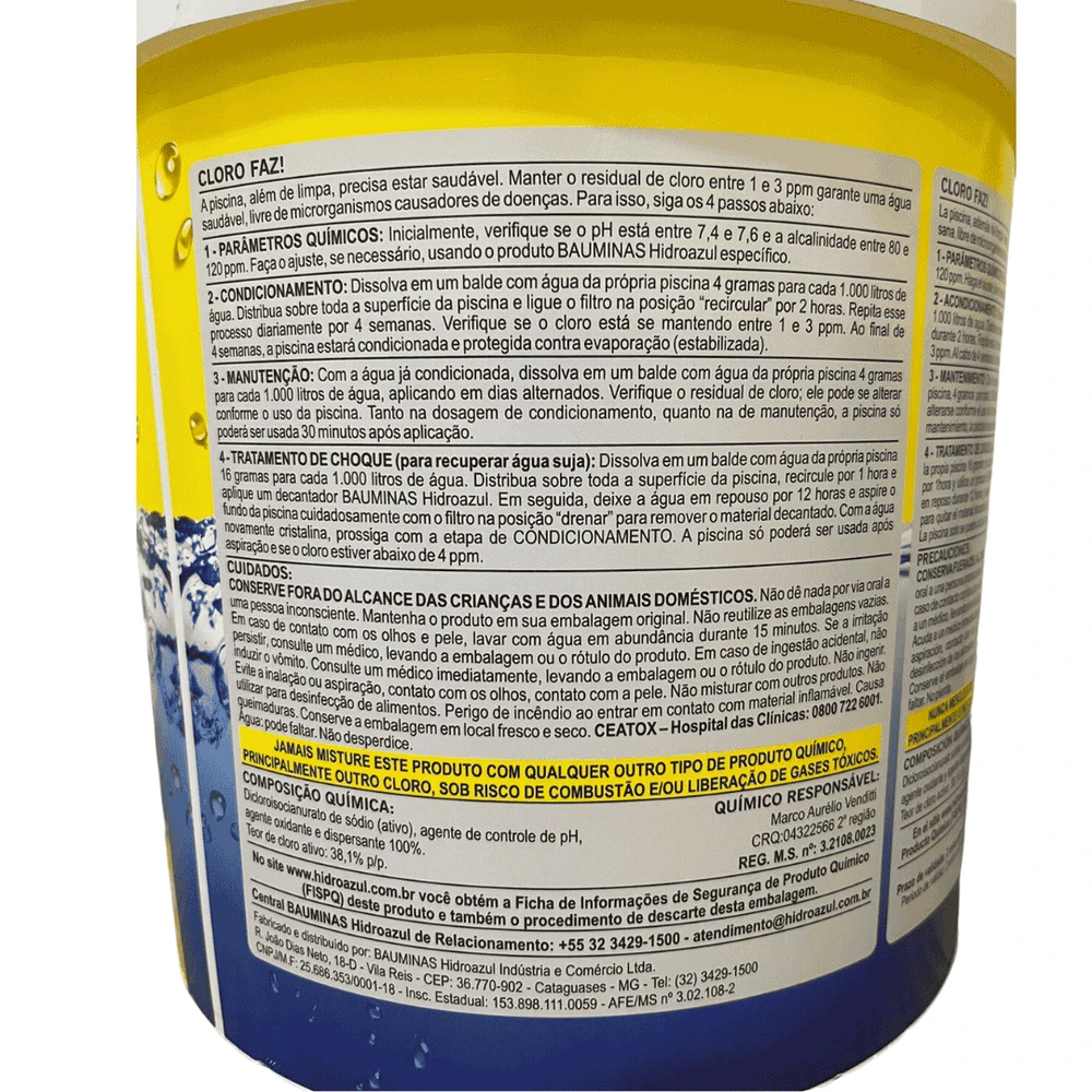 O FAZ! tem formulação exclusiva, possui como elemento ativo o Dicloroisocianurato de Sódio, composto orgânico clorado, excelente bactericida. Fonte disponível de cloro para desinfecção de piscinas. Possui agente estabilizador de cloro que inibe a degradação do cloro pela luz solar, mantendo o efeito desinfetante do cloro por mais tempo na piscina. É altamente solúvel. Possui agentes estabilizadores de pH e alcalinidade, mantendo o melhor equilíbrio químico da água, deixando a água sempre ideal para o banho. Possui oxidantes de materiais orgânicos eliminando odores e contaminantes que provocam consumo excessivo de cloro. Pode ser utilizado para destinação domiciliar ou institucional.