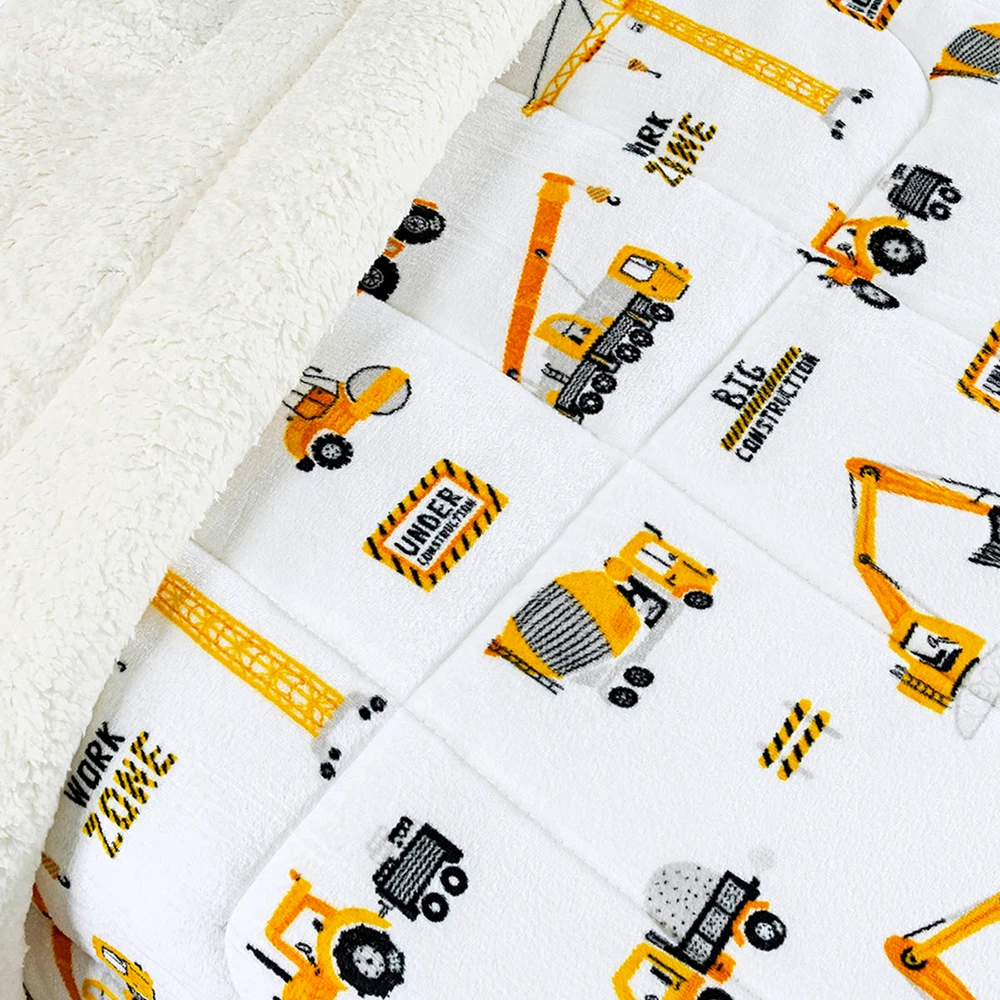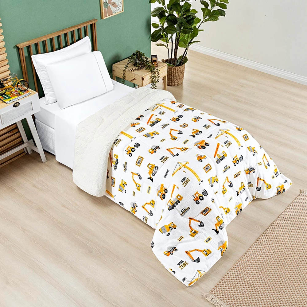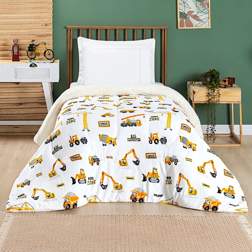 Coberdrom Cobertor Lutti Solteiro Quarto Cama Infantiil Sherpa Manta Toque Lã de Carneiro Trator Caminhão Branco