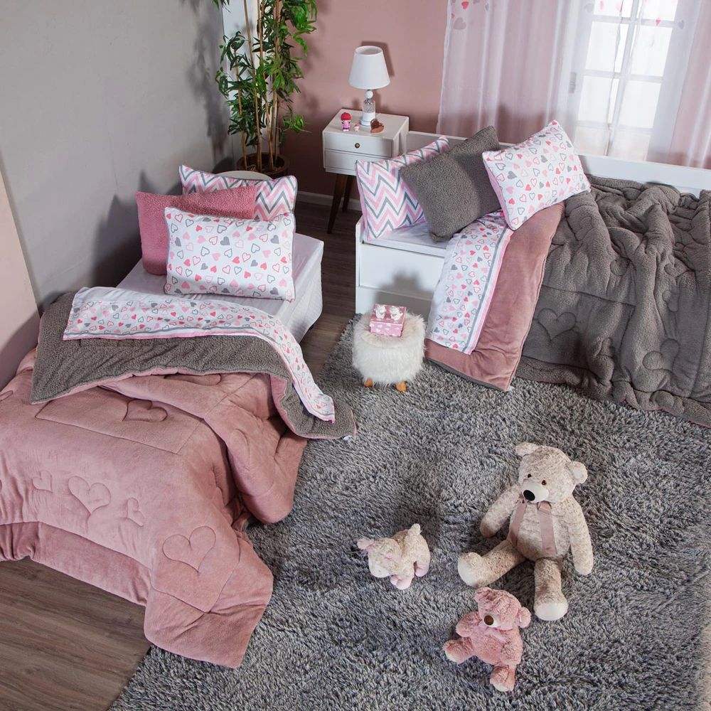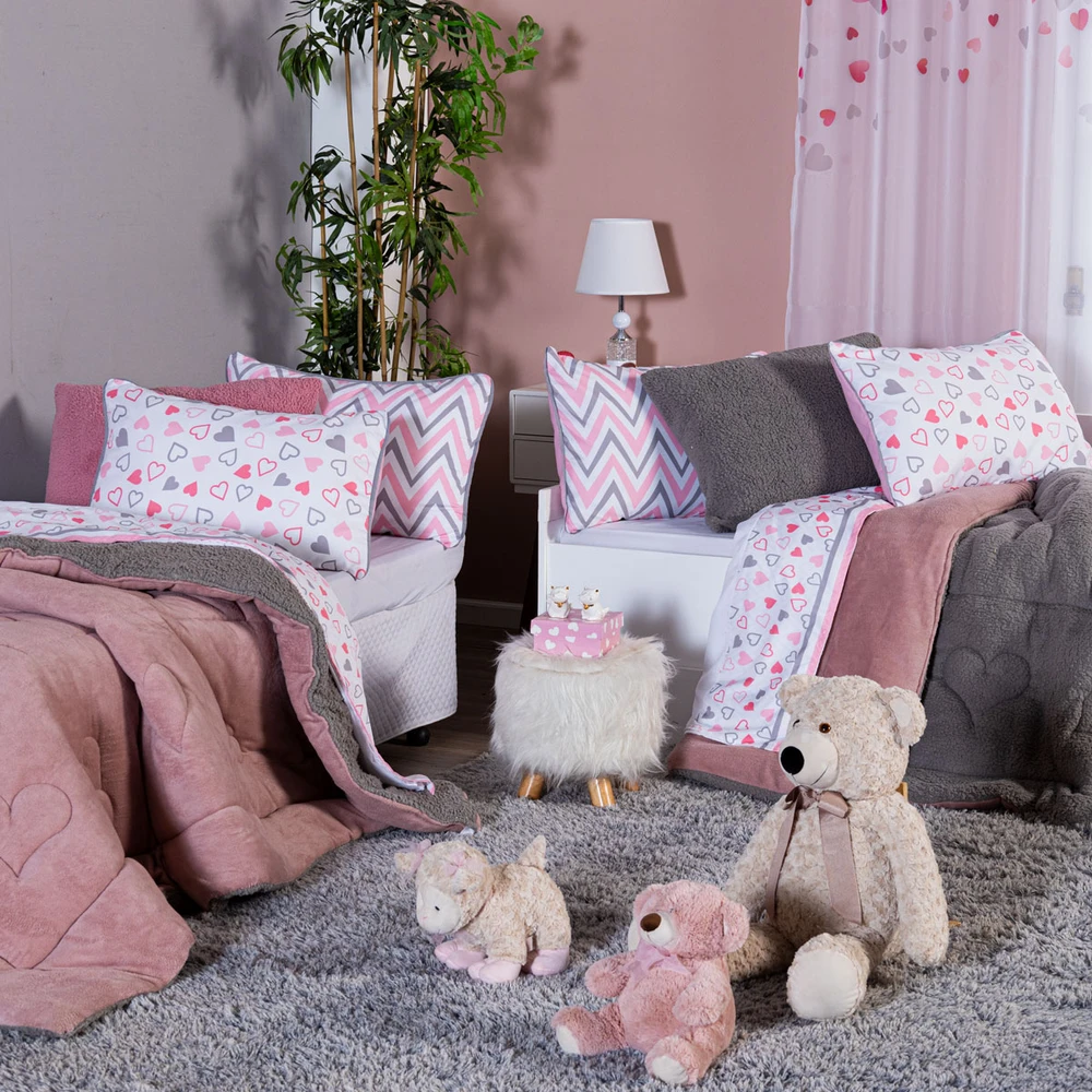 A nova coleção Corações traz toda a sofisticação e aconchego. Por possuírem dupla face, apresentam superfície que valoriza ainda mais as cores, confeccionado em pantográfica computadorizada com lindos desenhos temáticos pantografados no coberdrom! Composto de Manta Microfibra em poliéster com 150gr de enchimento e em Sherpa Colorida simulando lã de carneiro, extremamente macio e perfeito para aquecer. Acompanhando também um porta-travesseiro estampado de corações temático super moderno! Ideal para decorar, trazer conforto e tornar o quarto ainda mais convidativo e elegante! Confira!