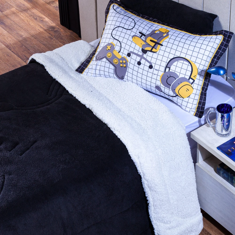 A nova coleção de Game Streamer traz toda a sofisticação e aconchego. Por possuírem dupla face, apresentam superfície que valoriza ainda mais as cores, confeccionado em pantográfica computadorizada com lindos desenhos temáticos pantografados no coberdrom! Composto de Manta Microfibra em poliéster com 150gr de enchimento e em Sherpa simulando lã de carneiro, extremamente macio e perfeito para aquecer. Acompanhando também um porta-travesseiro estampado temático super moderno! Ideal para decorar, trazer conforto e tornar o quarto ainda mais convidativo e elegante! Confira!