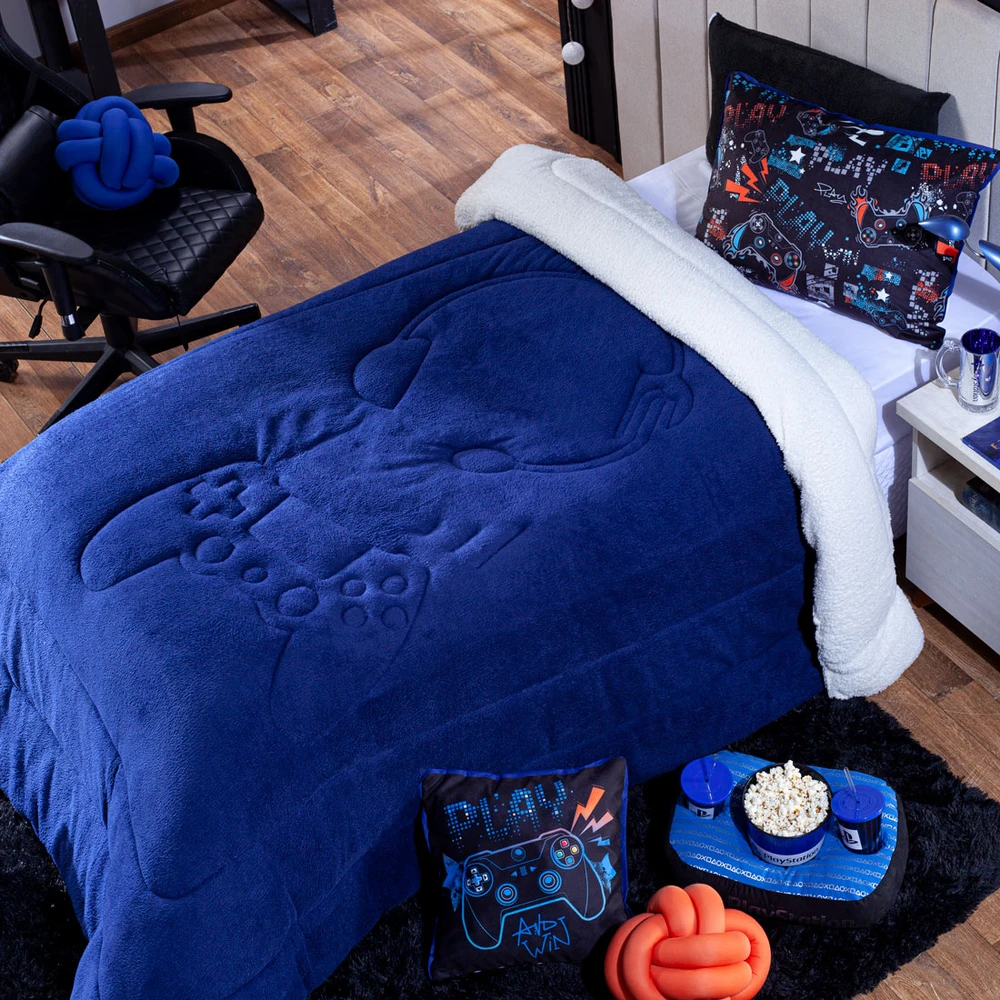 A nova coleção de coberdrons Game Win traz toda a sofisticação e aconchego. Por possuírem dupla face, apresentam superfície que valoriza ainda mais as cores, confeccionado em pantográfica computadorizada com lindos desenhos temáticos pantografados no coberdrom! Composto de Manta Microfibra em poliéster com 150gr de enchimento e em Sherpa simulando lã de carneiro, extremamente macio e perfeito para aquecer. Acompanhando também um porta-travesseiro estampado temático super moderno! Ideal para decorar, trazer conforto e tornar o quarto ainda mais convidativo e elegante! Confira!