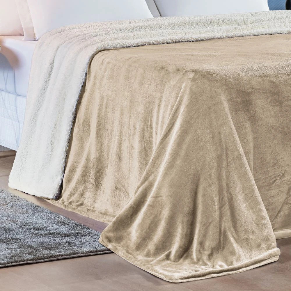 Dupla Face 2,60m x 2,40m Composição: Tecido Sherpa: 100% Poliéster Manta Flannel: 100% Poliéster