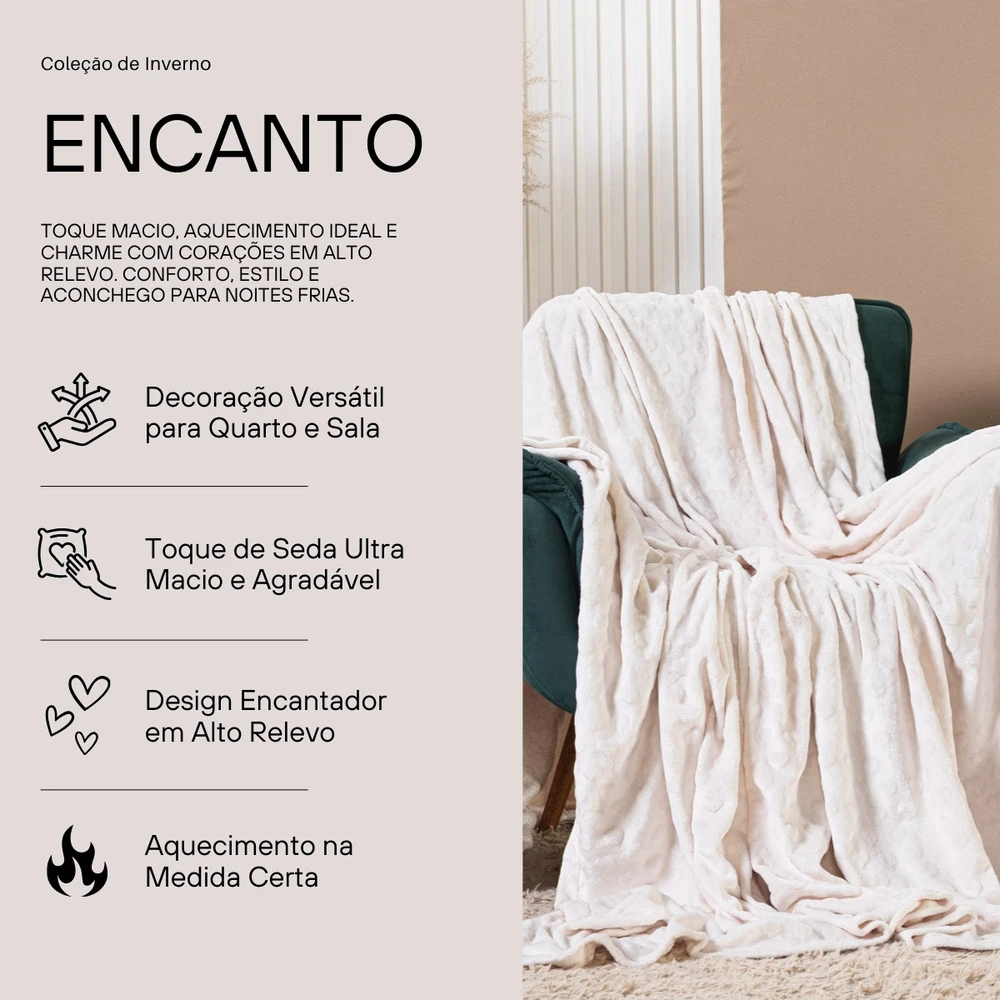 O Cobertor Encanto é perfeito para quem busca aconchego e estilo nos dias mais frios. Confeccionado em manta plush fleece com toque de seda, ele oferece maciez e conforto incomparáveis ao toque. Seu charme fica por conta do desenho delicado com detalhe de corações em alto relevo, que traz um visual romântico e sofisticado ao ambiente. Leve e versátil, é ideal para usar tanto na cama quanto no sofá, além de ser fácil de cuidar no dia a dia. Com medida ideal para camas de solteiro, essa mantinha é um convite ao bem-estar. Confira!