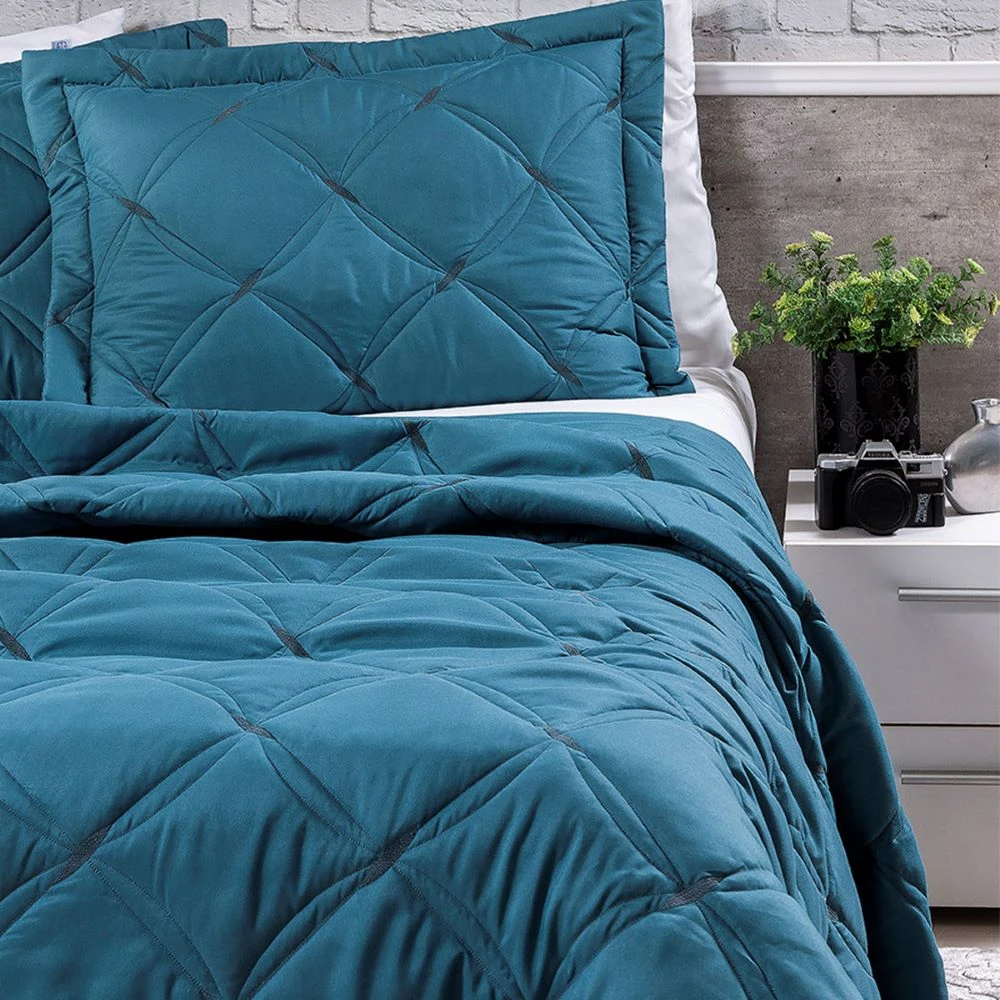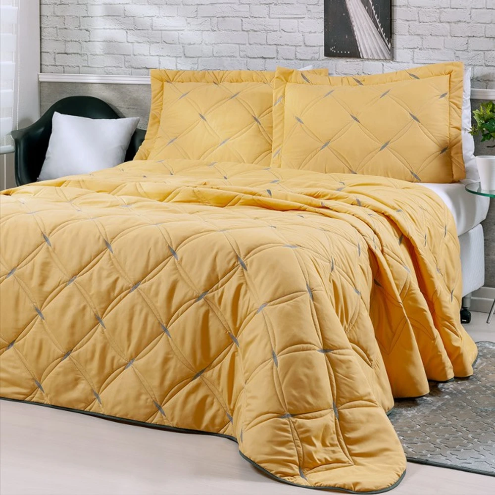 Uma cama com belo enxoval tem o poder de mudar todo o ambiente do quarto. O cobre leito Unique une a beleza dos bordados com uma paleta de cores modernas e atuais para formar uma cama posta acolhedora. O kit tamanho queen é composto por um cobre leito com bordado em linha e viés e dois portas travesseiros bordados com debrum (abas). O fechamento dos portas travesseiros é modelo envelope, portanto, não possui zíper. Todos os itens são fabricados em tecido hipercal 200 fios 100% poliéster, tecido esse que garante maciez e qualidade ao produto sem ser necessário passar com ferro após a lavagem.