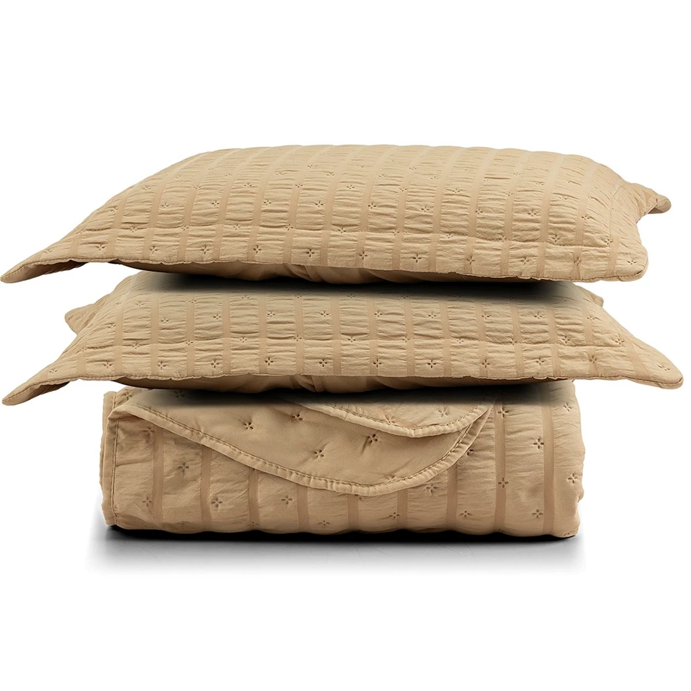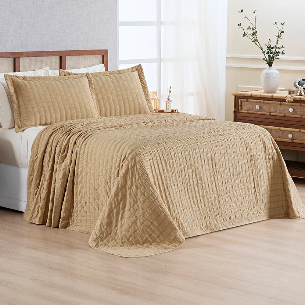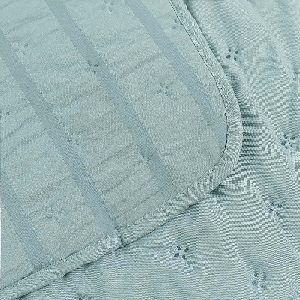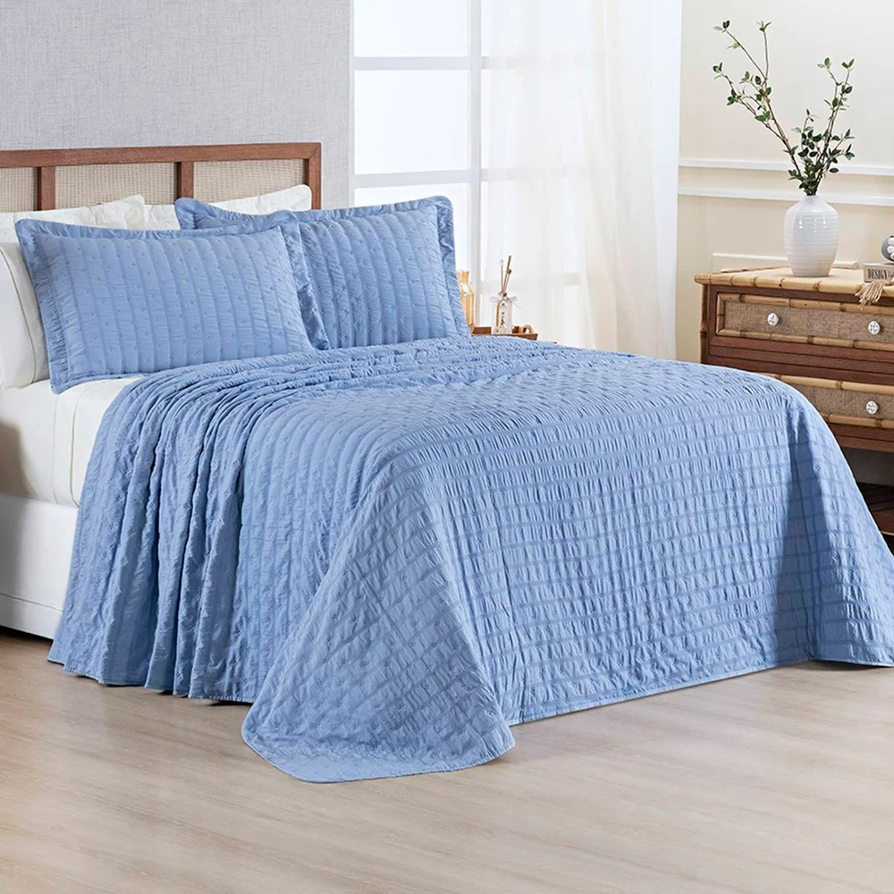 O Cobreleito Analu é confeccionado em tecido Seersucker 100% Poliéster, uma construção têxtil que possui textura plissada permanente, com leves ondulações que proporcionam um visual sofisticado e diferenciado à peça.