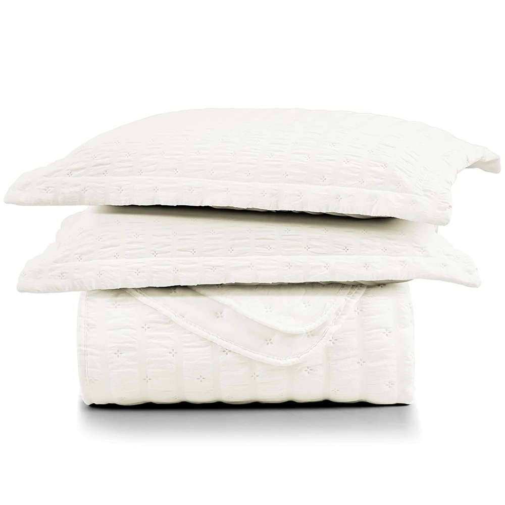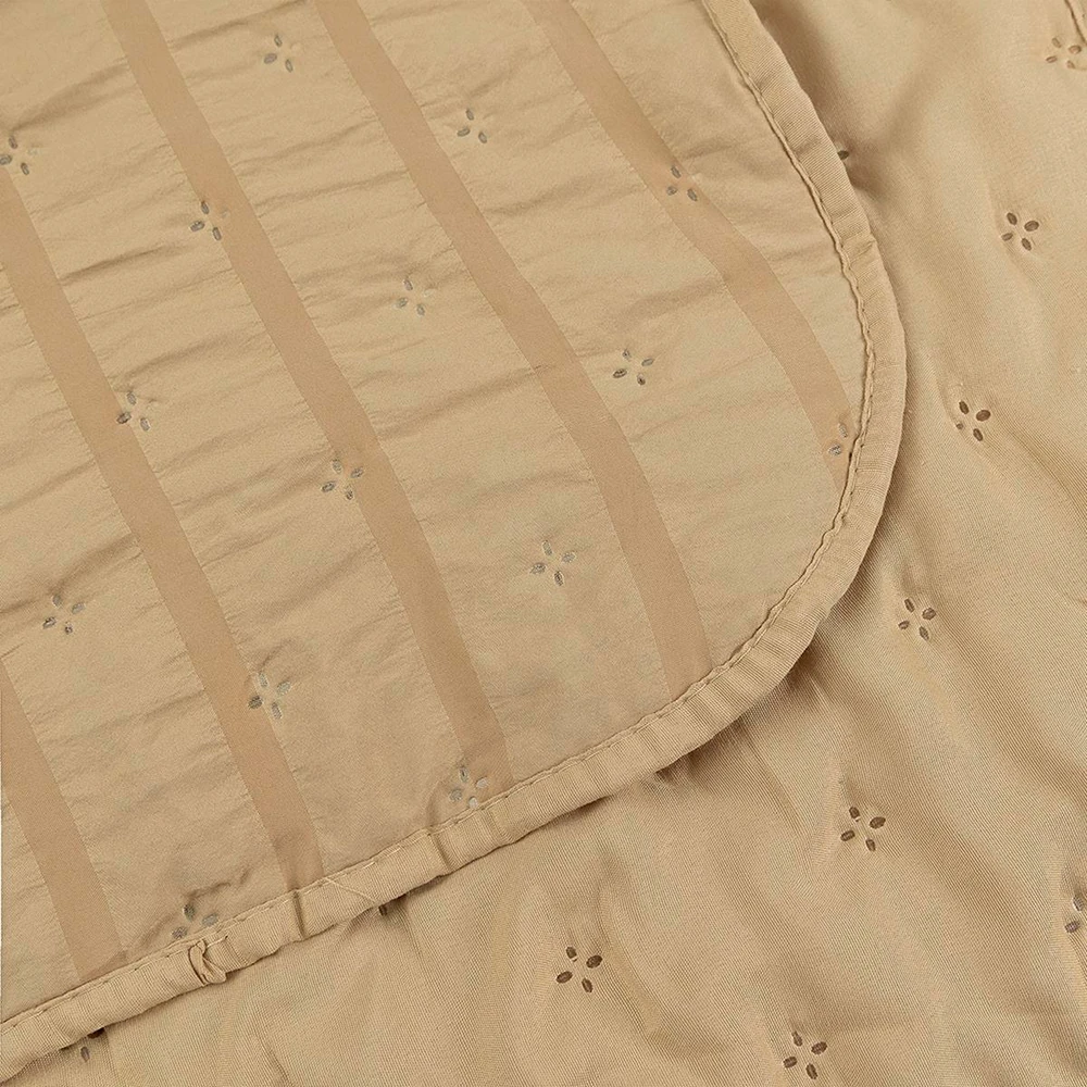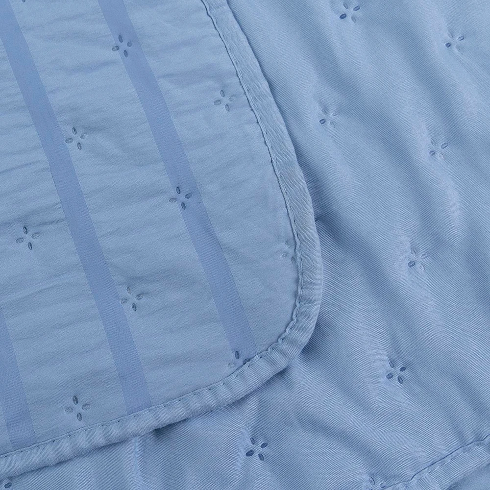 O Cobreleito Analu é confeccionado em tecido Seersucker 100% Poliéster, uma construção têxtil que possui textura plissada permanente, com leves ondulações que proporcionam um visual sofisticado e diferenciado à peça.