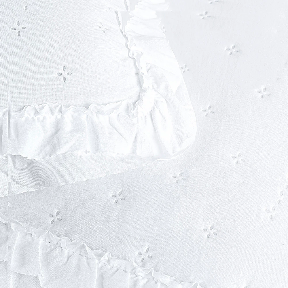 Os detalhes em babados delicados nas bordas dão um ar romântico e clássico ao conjunto, perfeito para composições que variam do moderno ao tradicional.