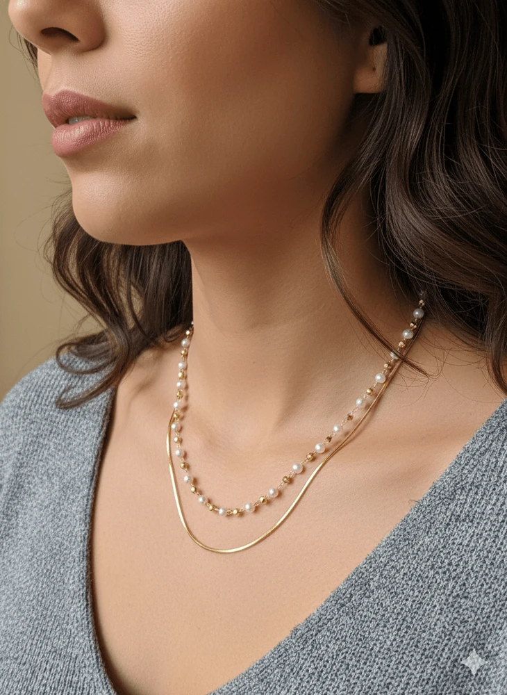 O efeito em camadas valoriza o colo e traz profundidade ao look, tornando o colar ideal tanto para produções minimalistas quanto para composições mais elaboradas. As pérolas adicionam um toque clássico e sofisticado, enquanto a corrente lisa garante modernidade e versatilidade à peça.