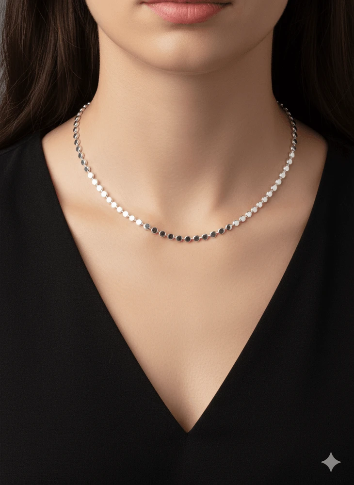 O Colar Camila é uma peça moderna e minimalista, ideal para quem busca um acessório elegante com design limpo e atual. Desenvolvido com corrente delicada, o colar apresenta pequenas placas redondas polidas dispostas de forma contínua, criando um efeito sofisticado e contemporâneo.