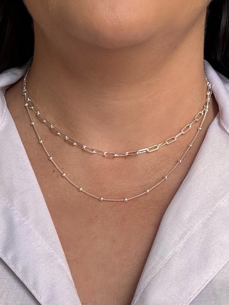 Feito com materiais de alta qualidade, esse colar possui duas correntes delicadas, uma com bolinhas e outra lisa, que se unem em um fecho prático e seguro. Além disso, suas correntes são ajustáveis, garantindo que ele fique perfeito no seu pescoço.
